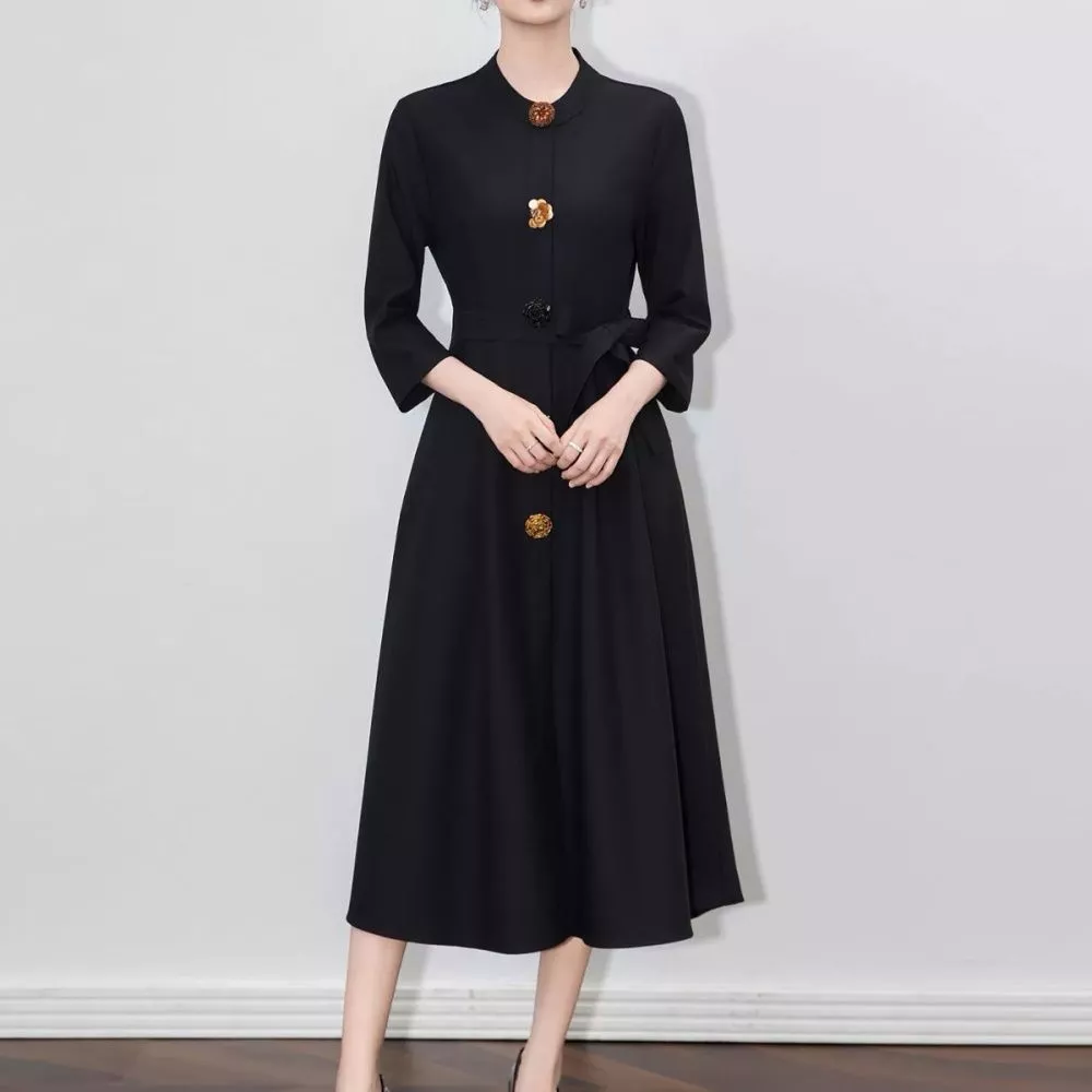 Vestito Lungo Elegante Nero Con Collo Alla Coreana E Cintura In Vita CF66017