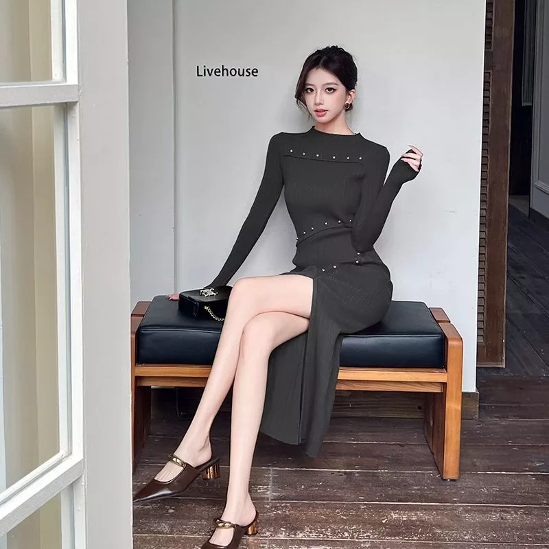 Vestito Lungo Elegante Aderente A Maglia Con Spacco Laterale Grigio CF66067