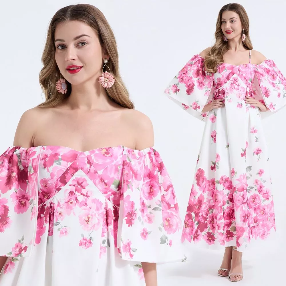 Vestito Lungo Floreale Rosa Spalle Scoperte Maniche Ampie CF68245