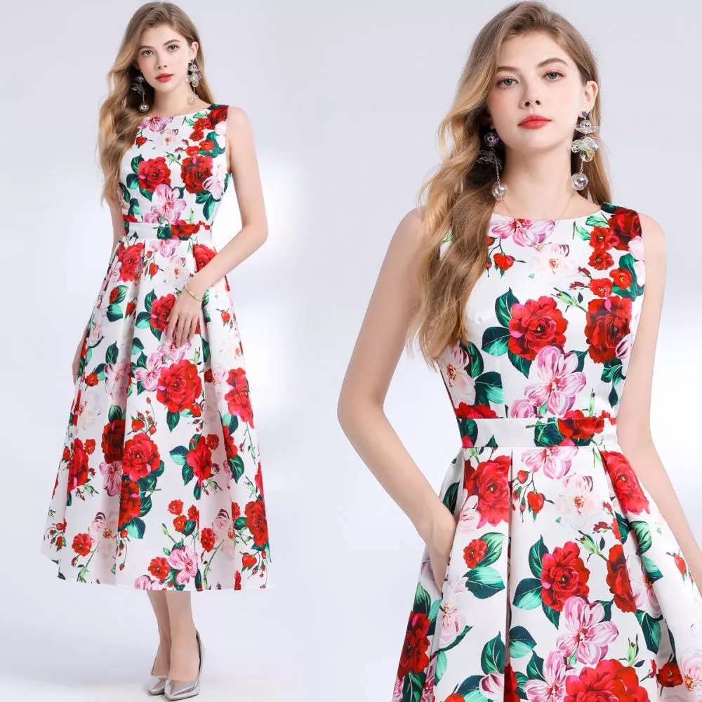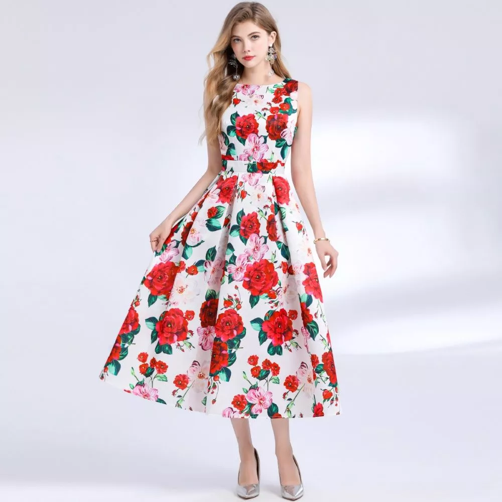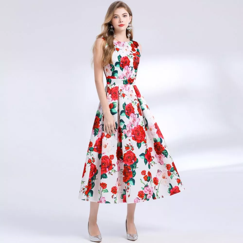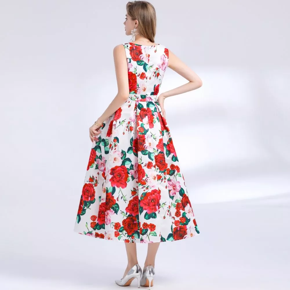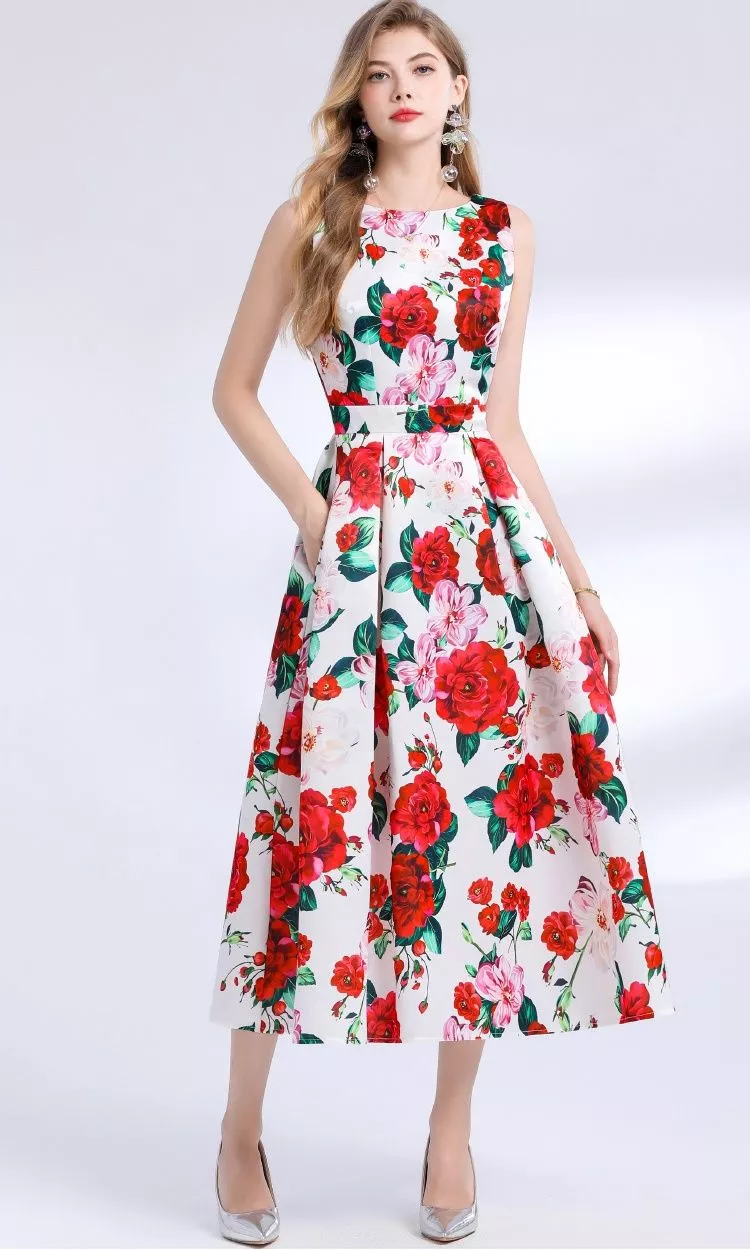 Abito Bianco Fiori Rossi E Rosa Senza Maniche Elegante Con Gonna Svasata CF48393