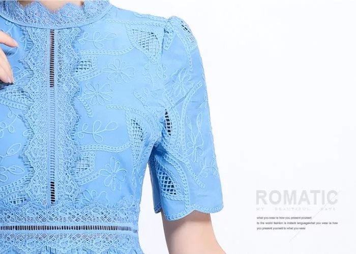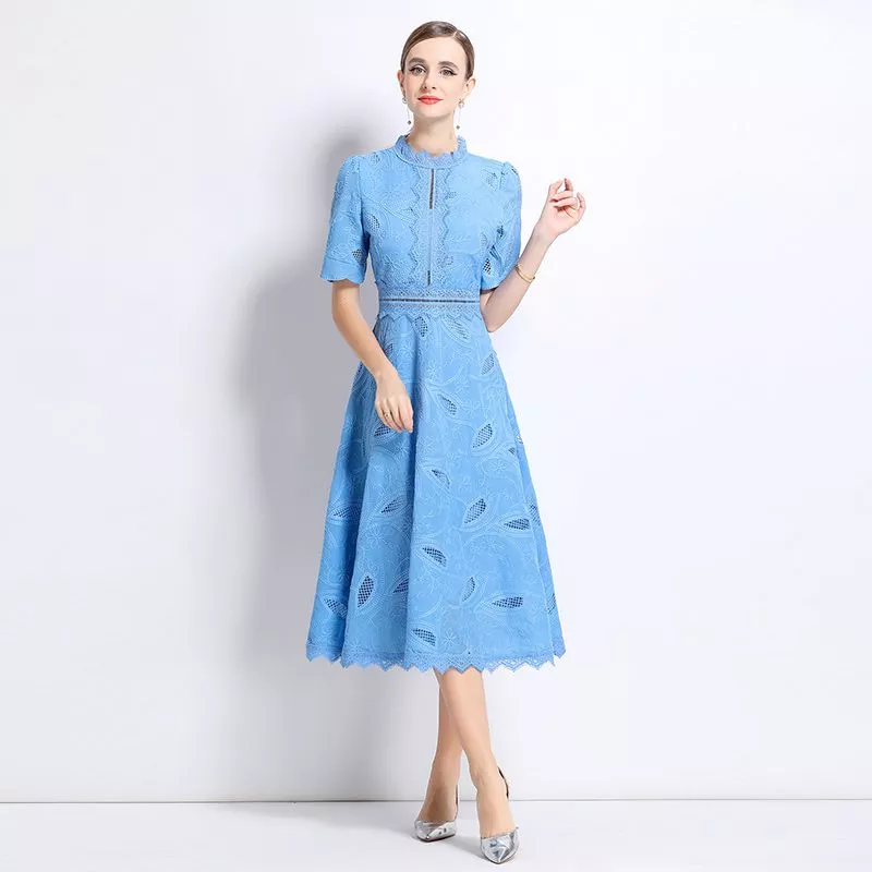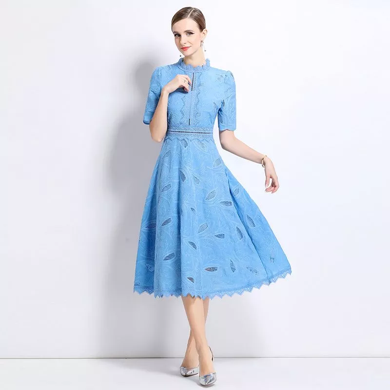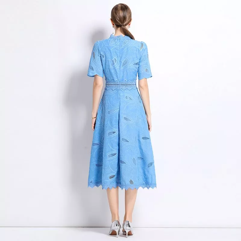 Raffinato abito blu marino con lavorazione ricamata su tutta la superficie e silhouette dalla linea slim con ampia gonna svasata. Le maniche corte, lo scollo decorato e il colletto smerlato donano un tocco elegante e sofisticato. Perfetto per eventi speciali, cerimonie e occasioni dove è richiesto un look curato e femminile. Il tessuto leggero e il taglio svasato valorizzano ogni tipo di figura, regalando una vestibilità comoda e armoniosa.