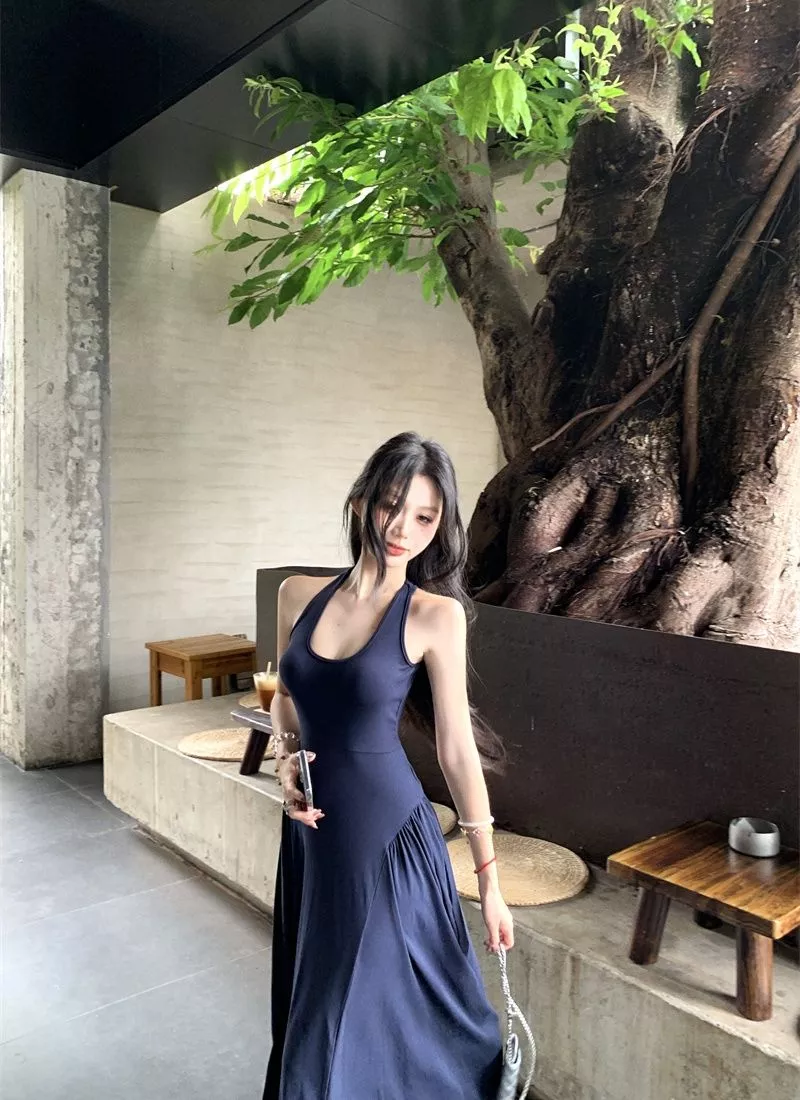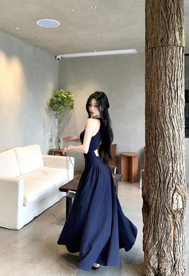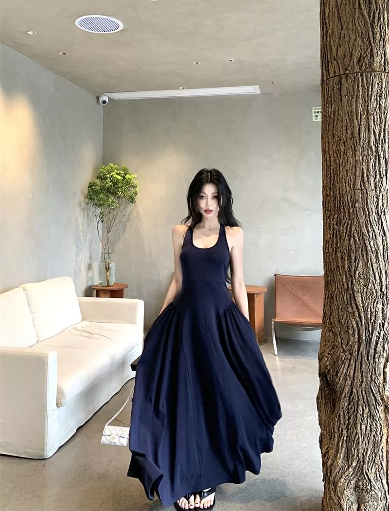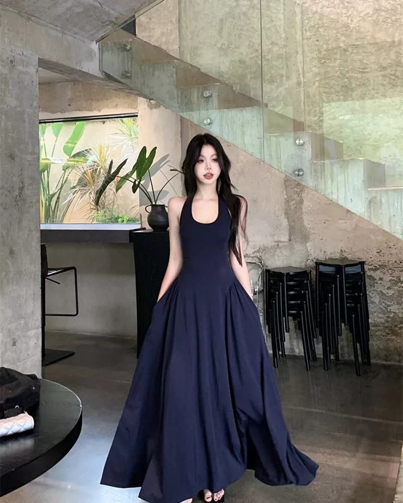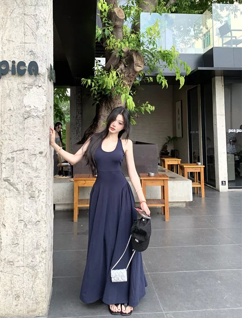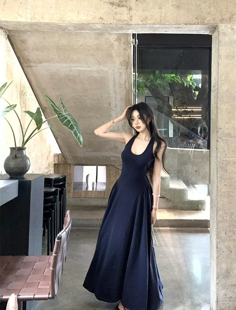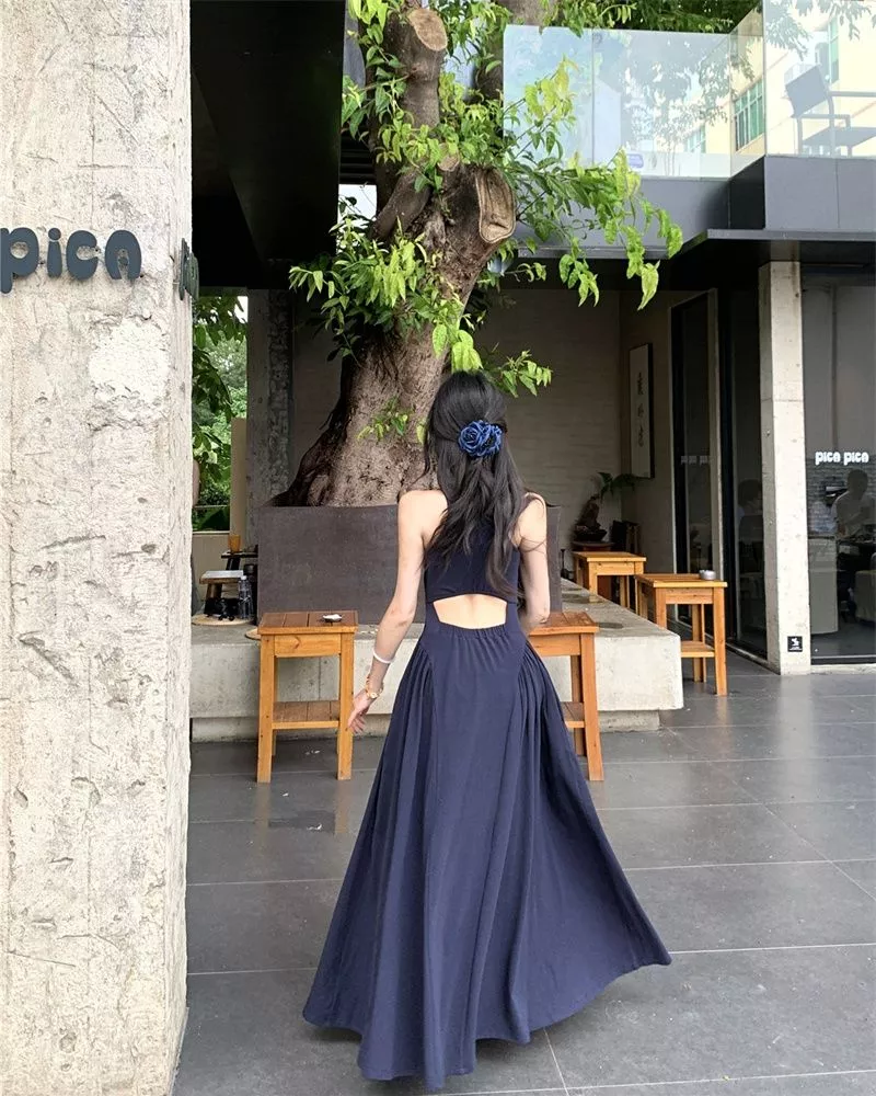 Scopri l’eleganza estiva con questo abito lungo blu marino, caratterizzato da un taglio svasato e un design raffinato. Il corpino aderente con spalline valorizza la figura, mentre l’ampia gonna regala movimento e leggerezza. La particolarità della schiena scoperta con apertura posteriore dona un tocco sexy ma discreto, perfetto per serate speciali, aperitivi al tramonto o vacanze chic.