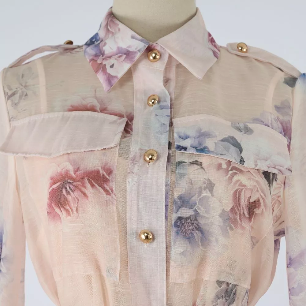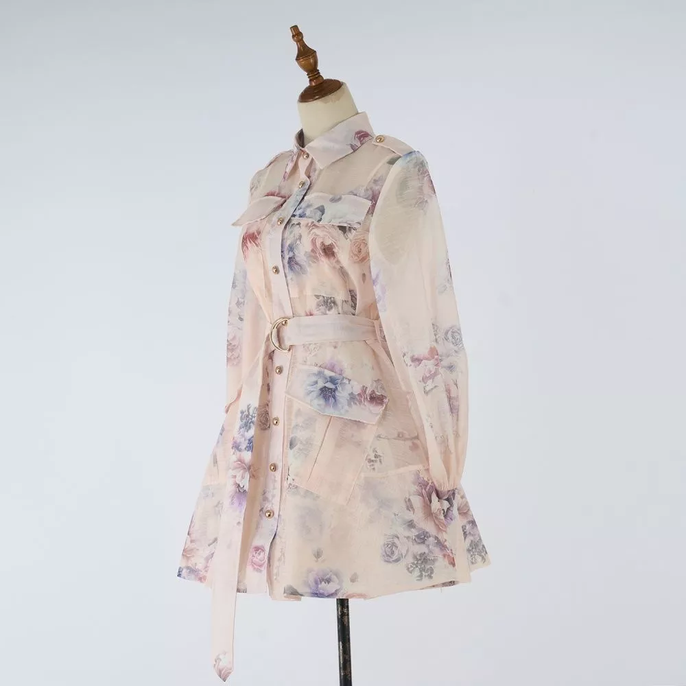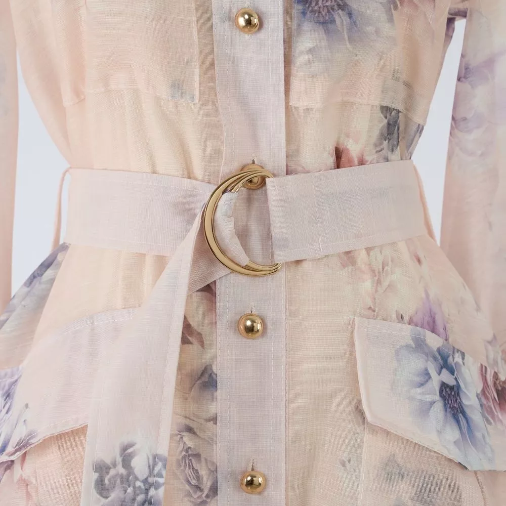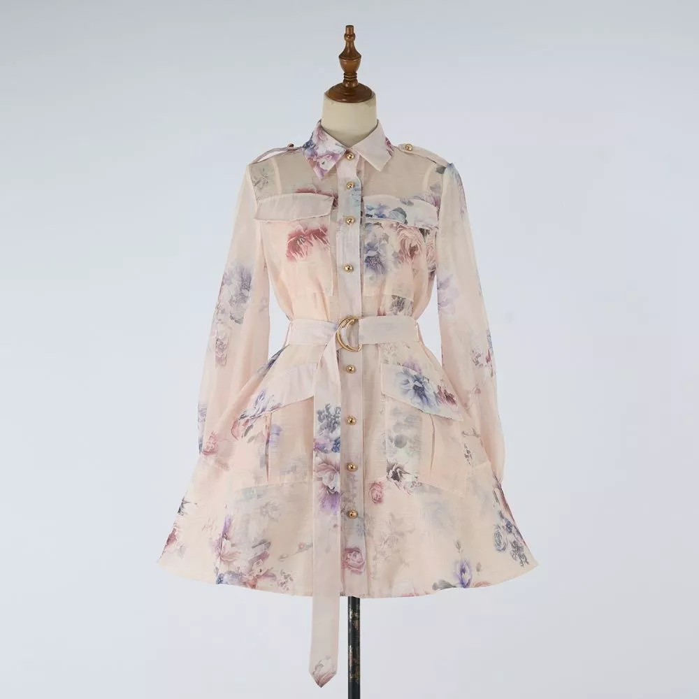 Abito camicia con stampa floreale delicata e linea svasata, dotato di cintura regolabile in vita con fibbia dorata.