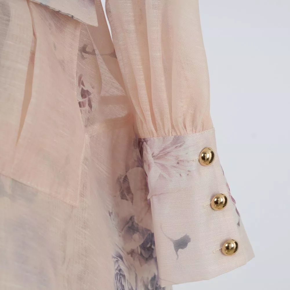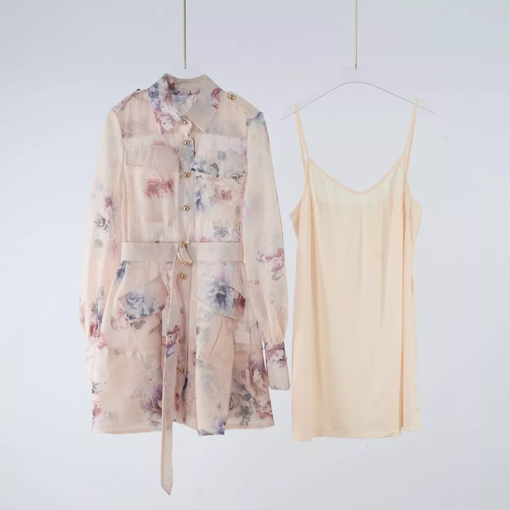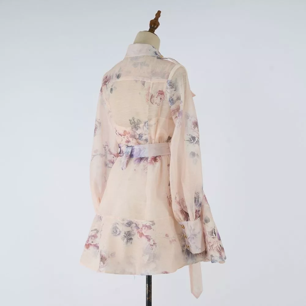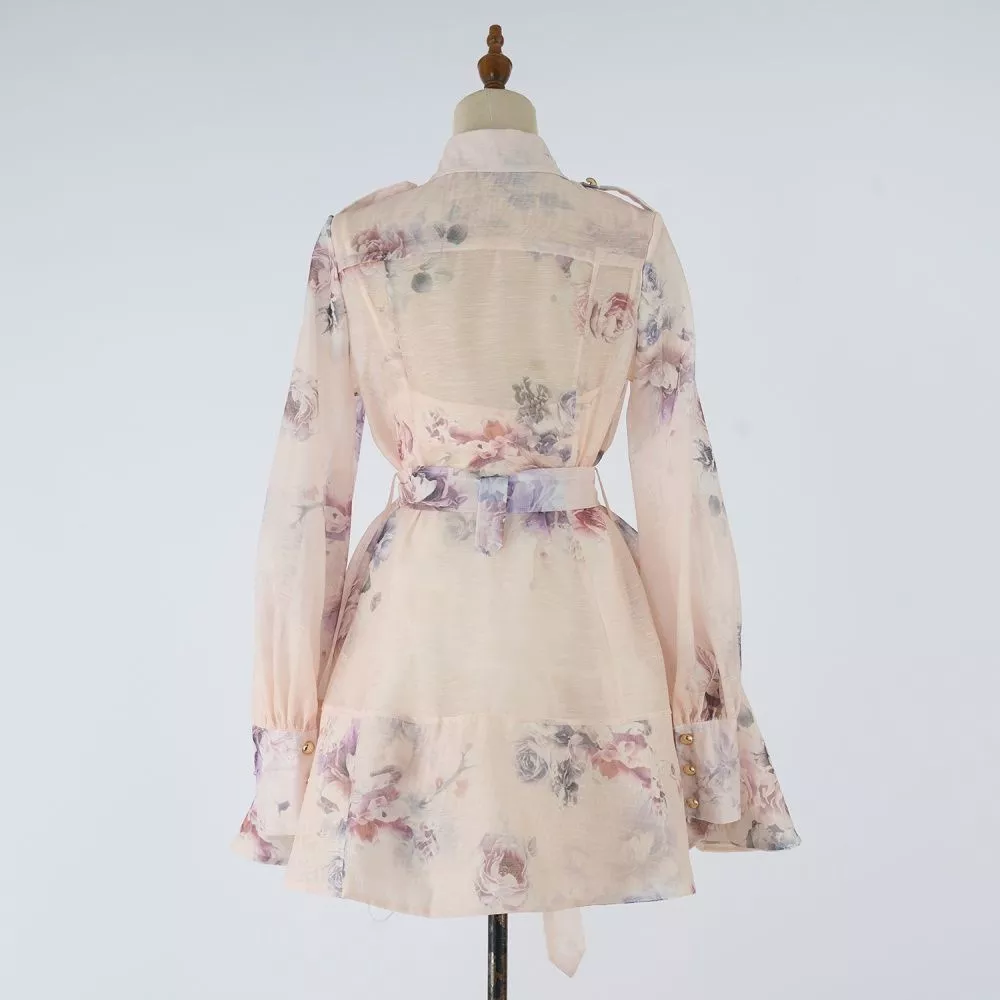 Abito camicia con stampa floreale delicata e linea svasata, dotato di cintura regolabile in vita con fibbia dorata.