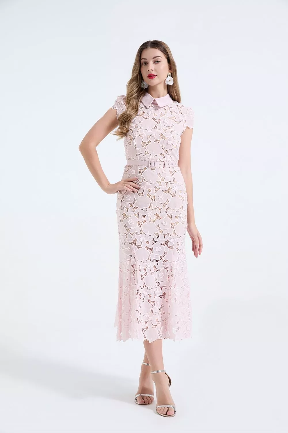 Abito Cerimonia Midi In Pizzo Floreale Con Colletto E Cintura Rosa CF68243
