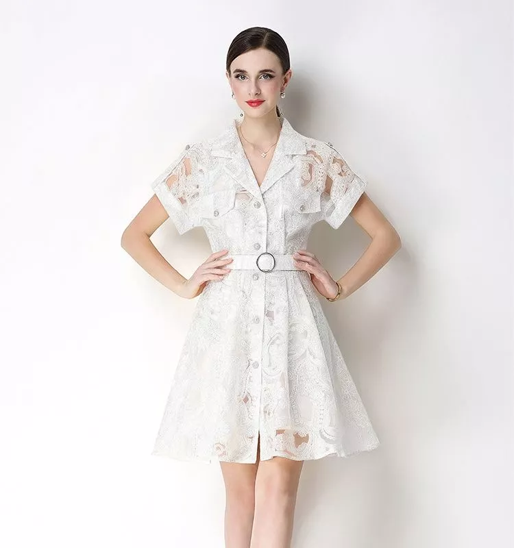 Abito chemisier dal gusto bon ton con silhouette svasata e cintura che valorizza il punto vita. La lavorazione effetto pizzo rende il modello raffinato e luminoso, mentre il taglio femminile con colletto sartoriale dona eleganza senza tempo. Un vestito perfetto per cerimonie, eventi o look sofisticati da giorno.
