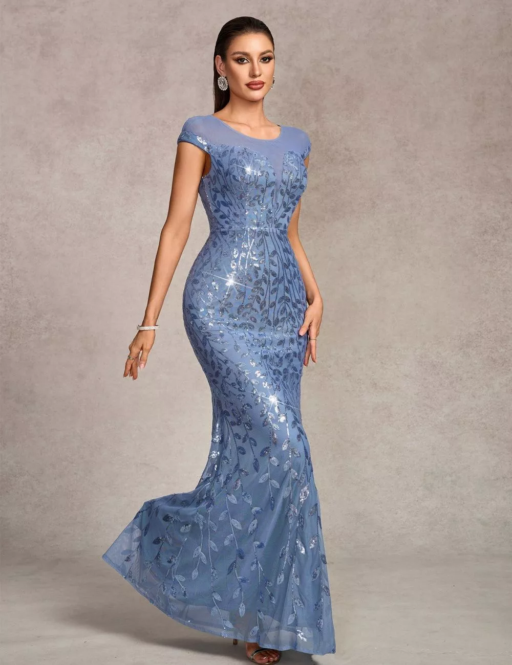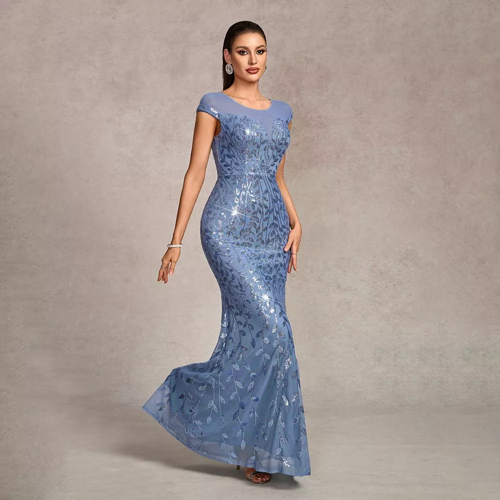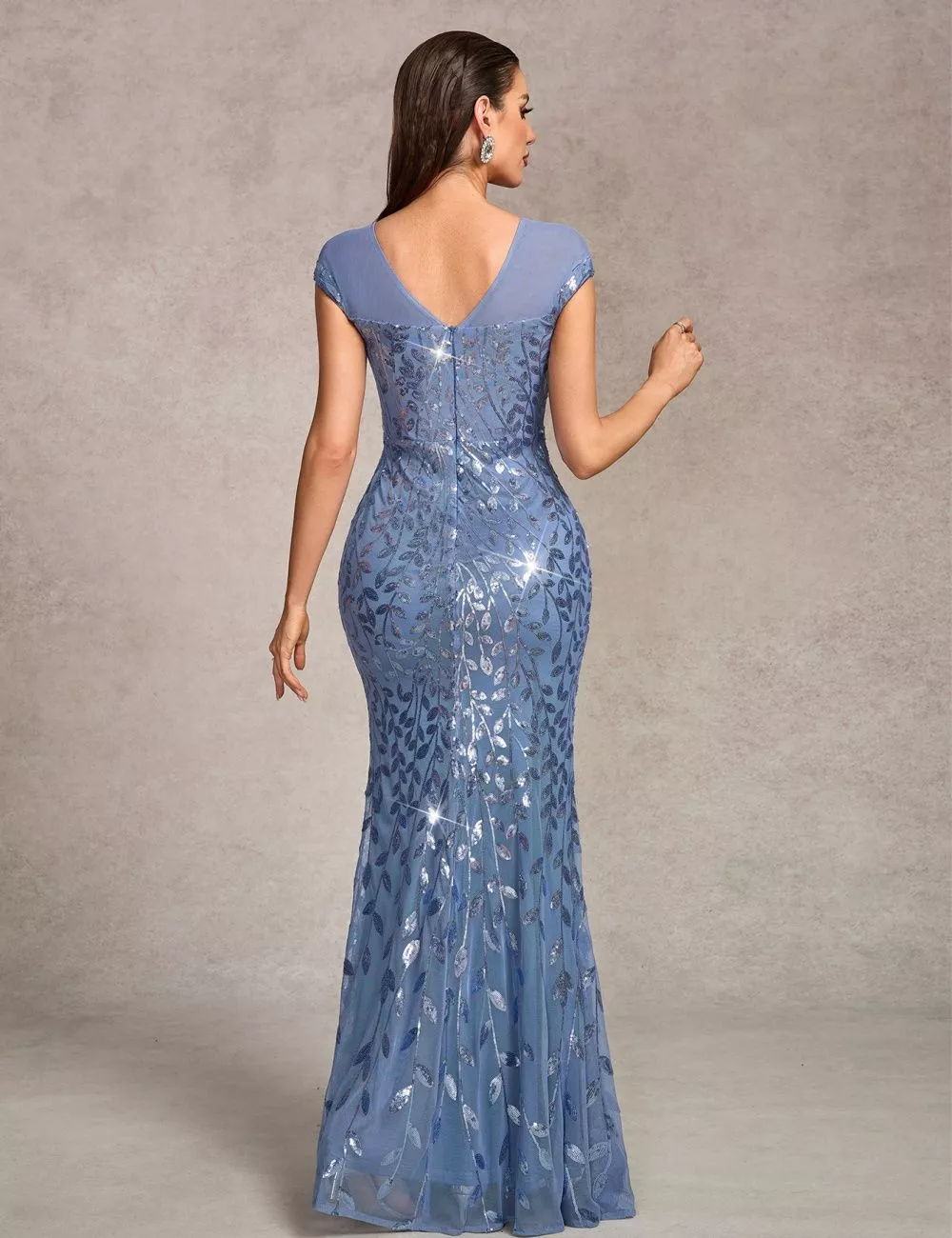 Abito Da Sera Donna Lungo Sirena Con Paillettes Scollo Elegante Azzurro CF69772