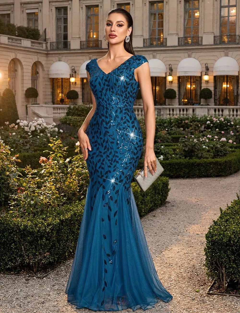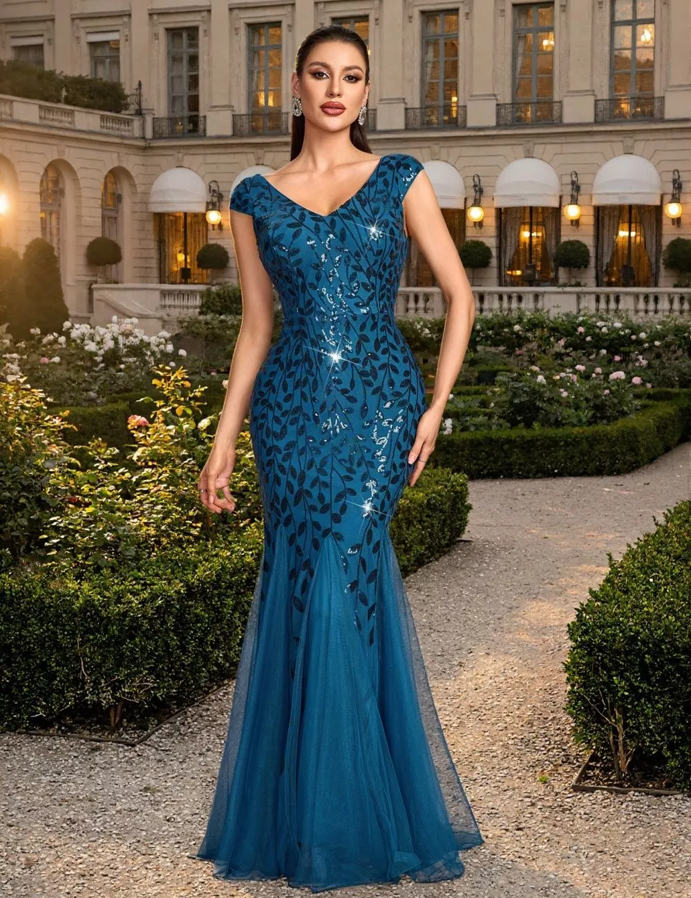 Abito Da Sera Donna Lungo Sirena Paillettes Scollo V Elegante Blu Pavone CF69775