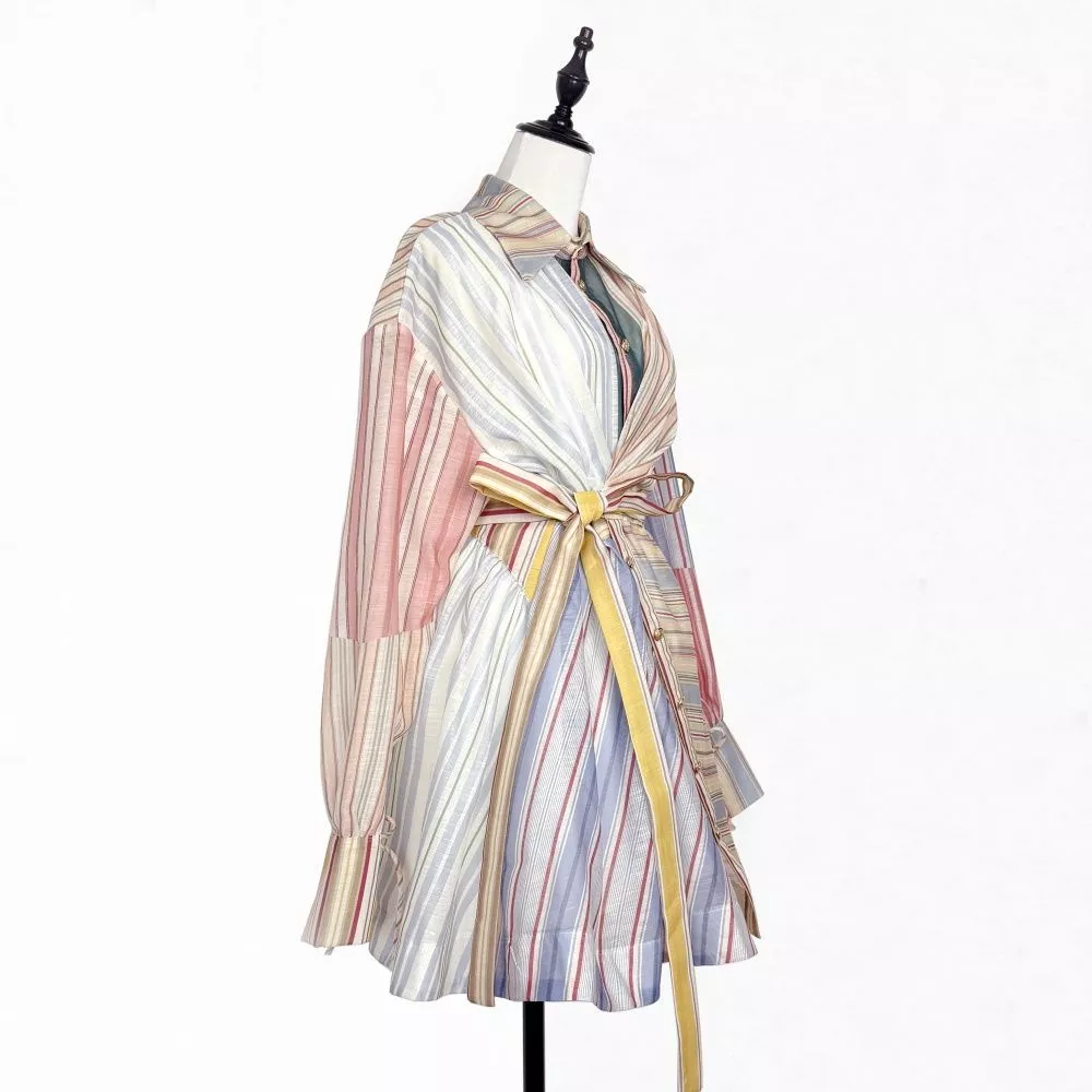 Abito Donna A Righe Multicolor Con Collo A Camicia E Cintura Elegante CF64746