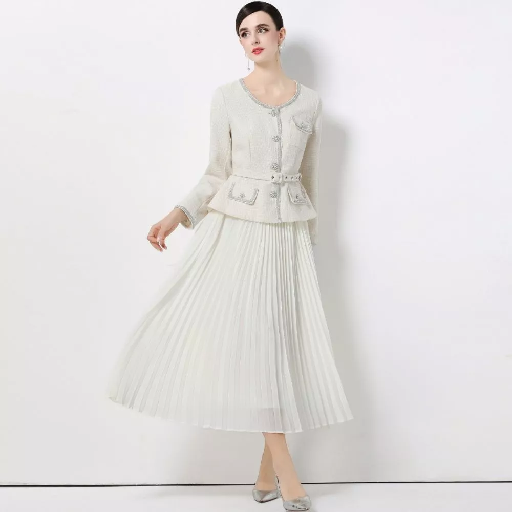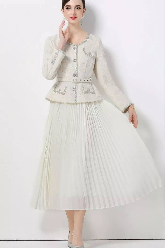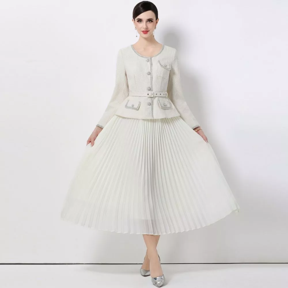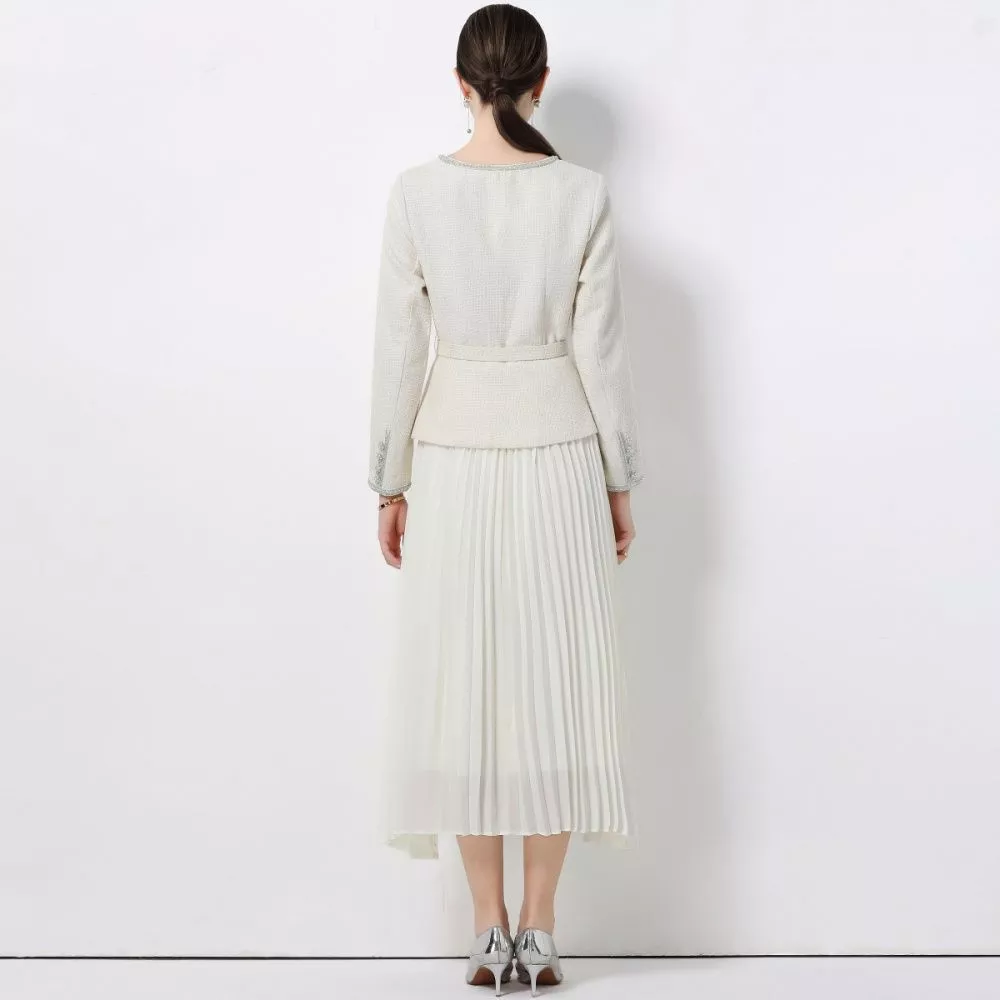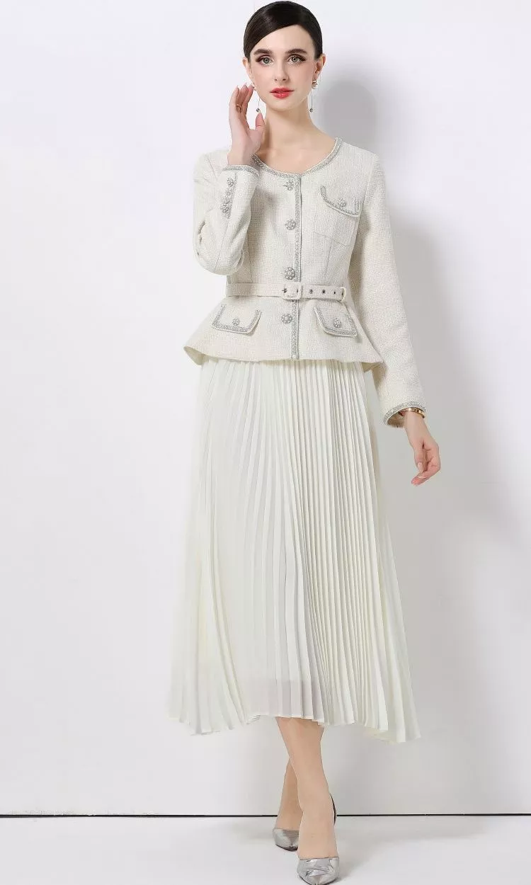 La gonna lunga plissettata dona movimento e leggerezza, creando un equilibrio armonioso tra parte superiore strutturata e parte inferiore fluida.