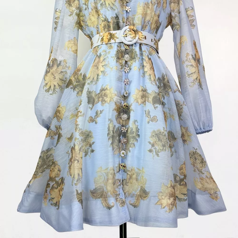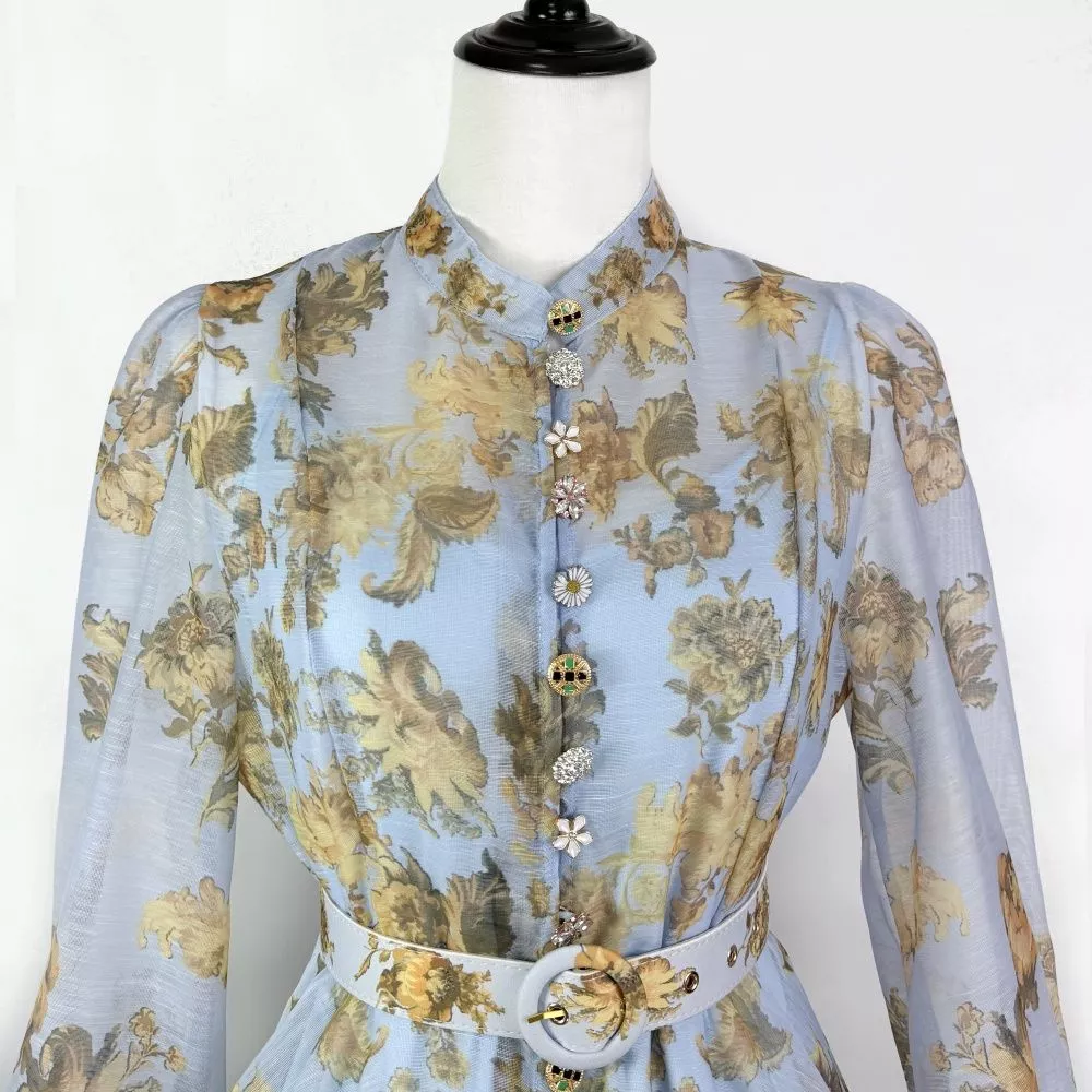 Vestito donna elegante con stampa floreale romantica e cintura coordinata che valorizza la silhouette. La linea svasata e le maniche lunghe leggere creano un look raffinato e femminile perfetto per cerimonie, eventi e occasioni speciali. Il design fluido e la vestibilità armoniosa rendono questo abito ideale per outfit chic e senza tempo.