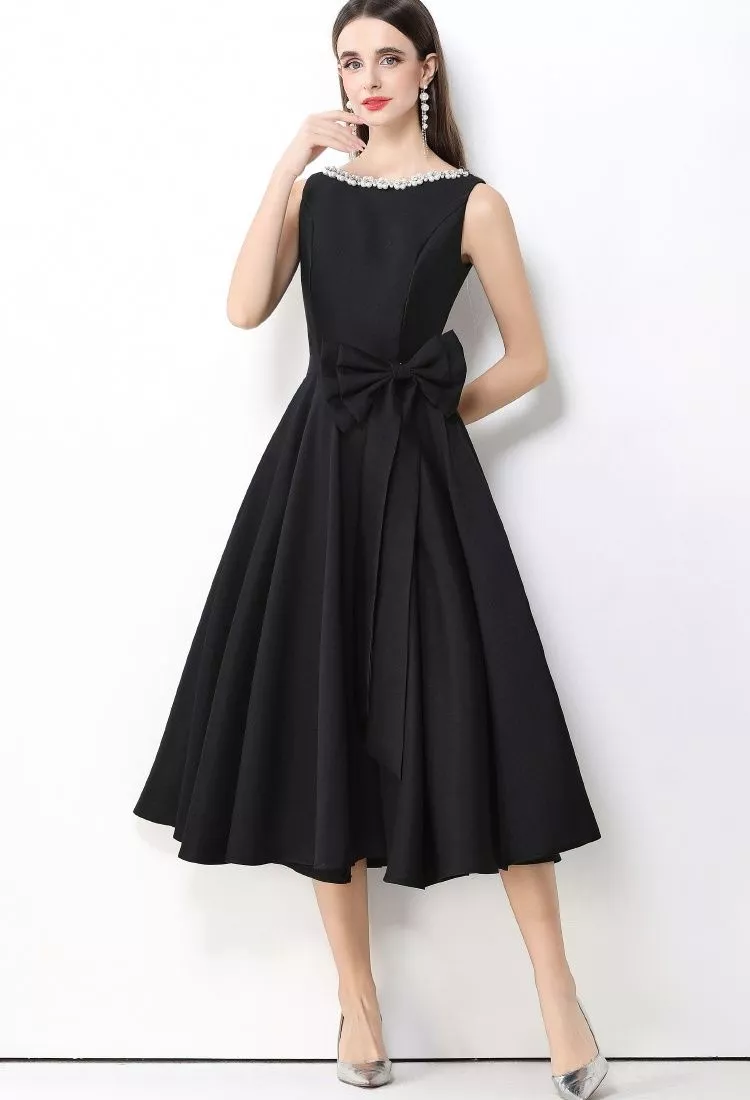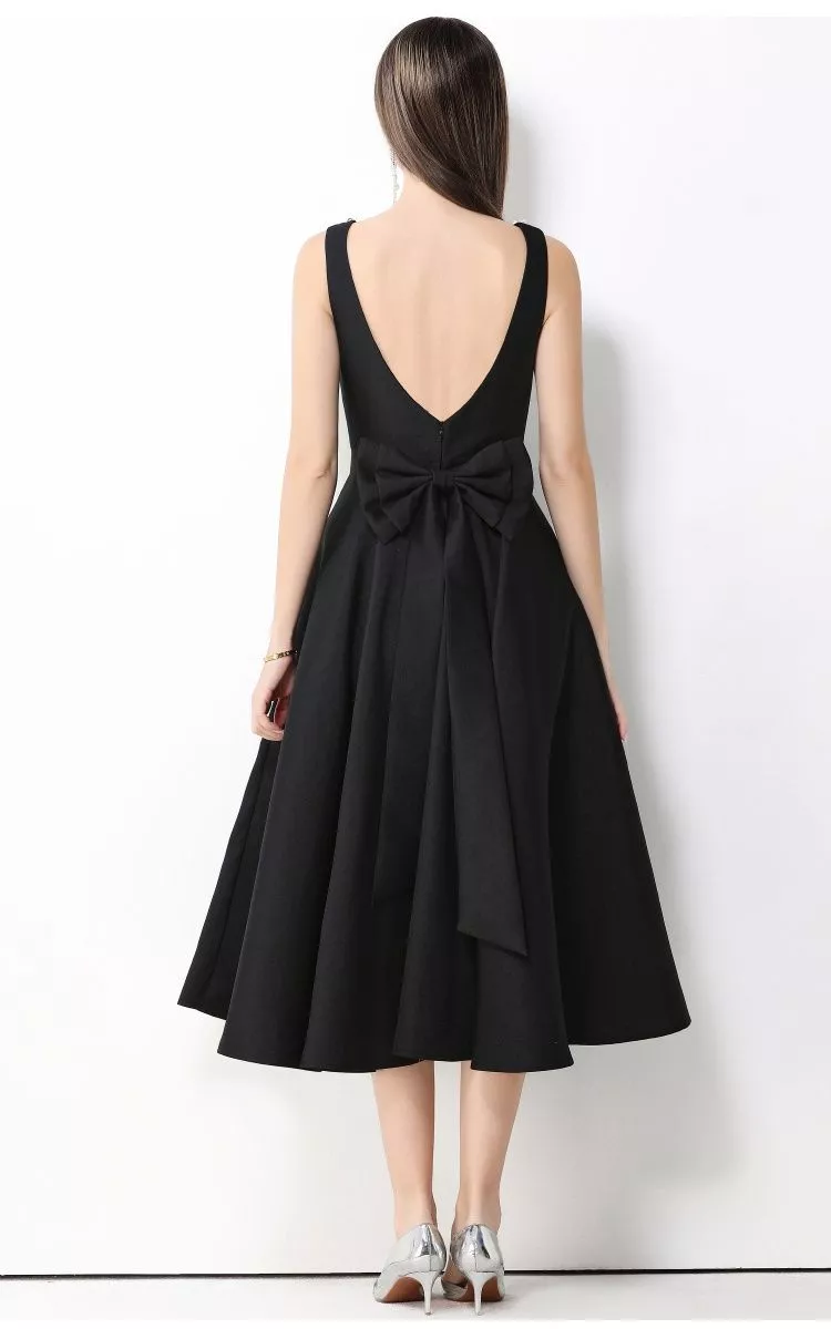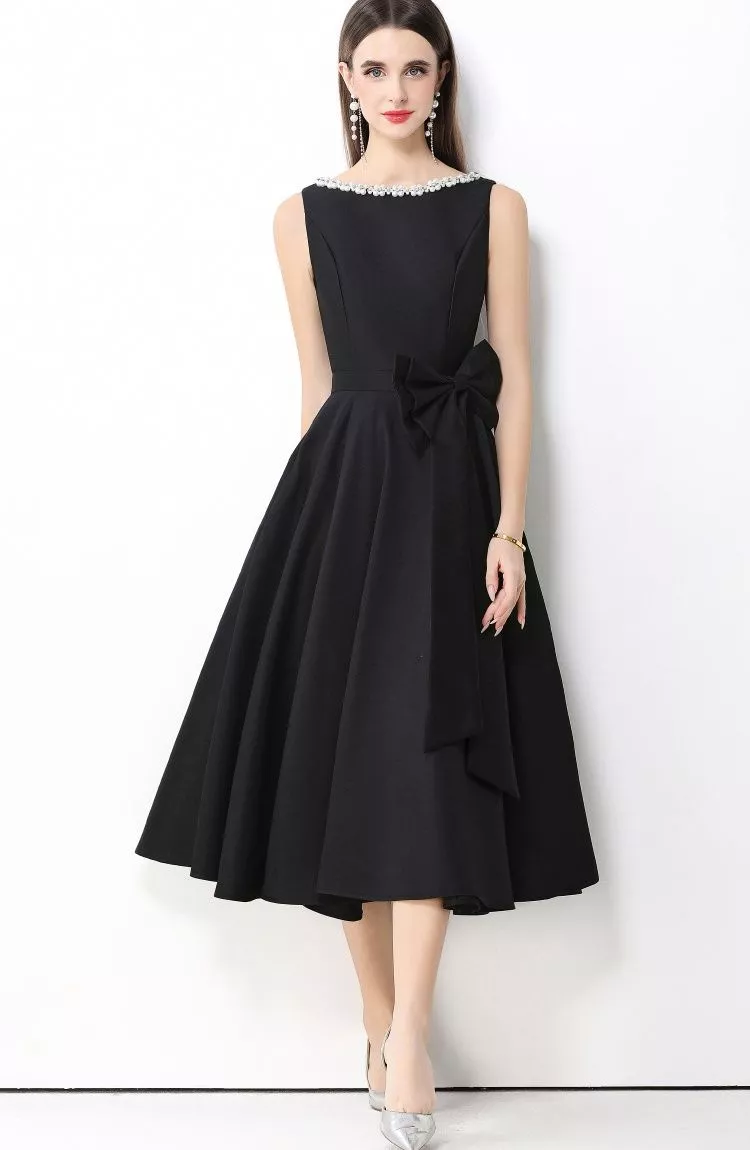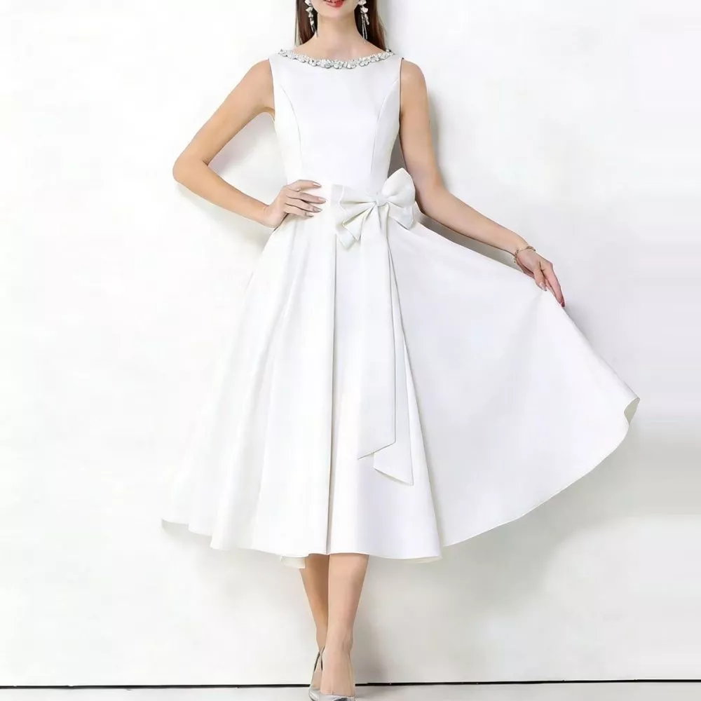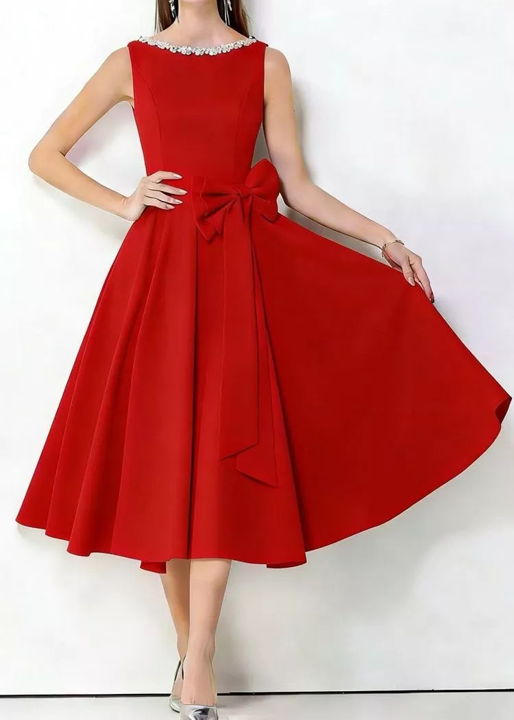 Il dettaglio del fiocco applicato in vita aggiunge un tocco distintivo e ricercato, rendendo il modello ideale per cerimonie, eventi serali, feste eleganti e occasioni formali. Il tessuto in raso dalla finitura luminosa dona un aspetto sofisticato e curato, perfetto per chi desidera un abito d'impatto senza eccessi.