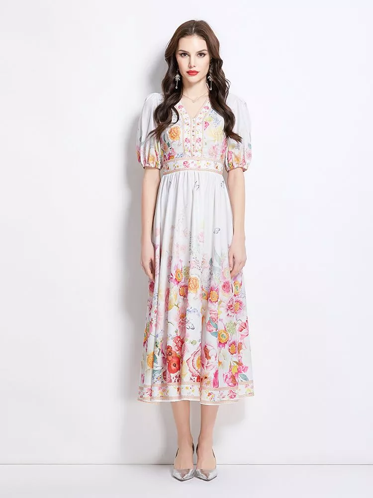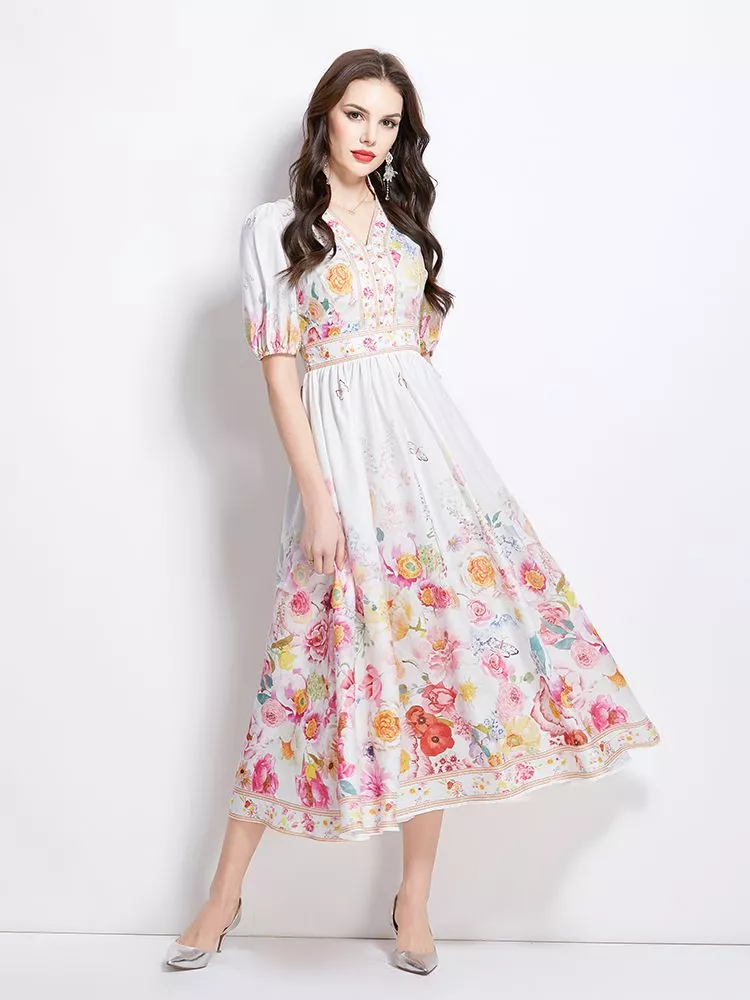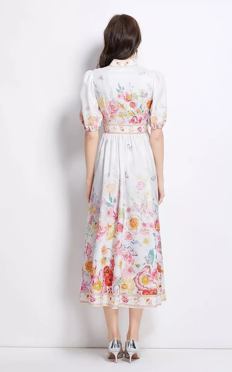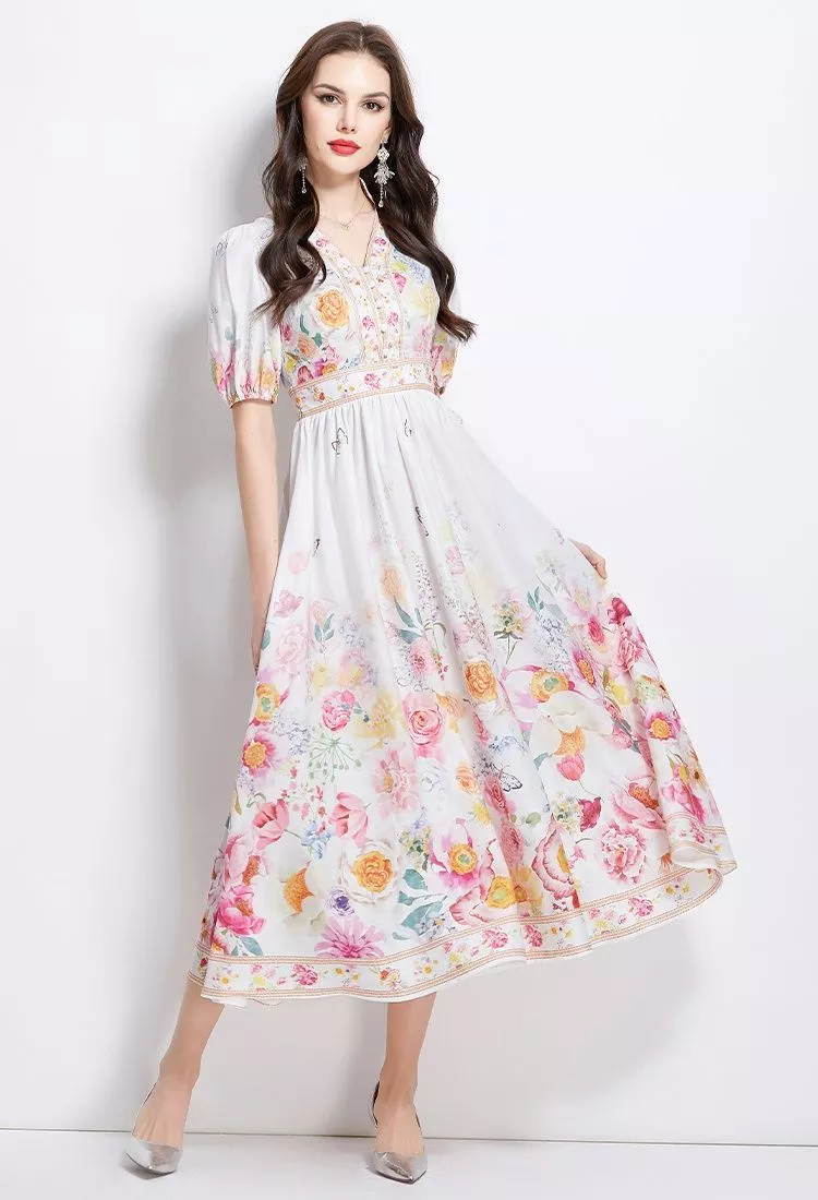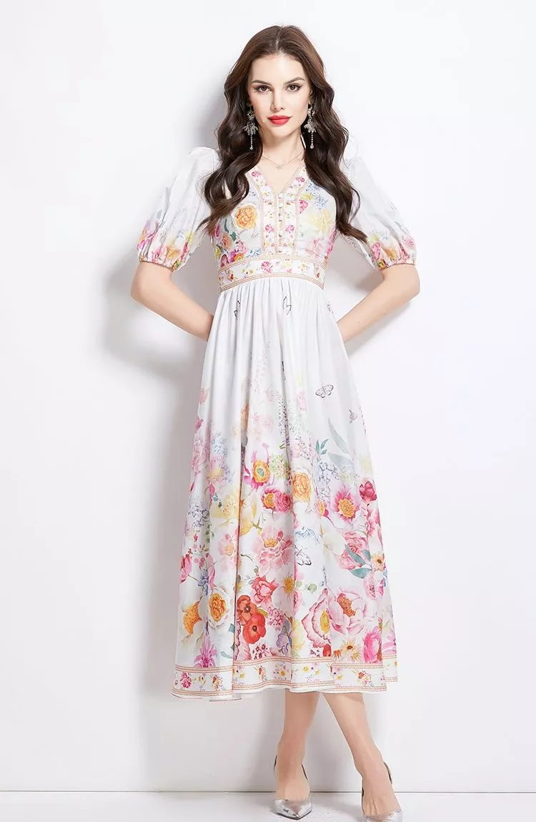 Abito Donna Elegante Lungo Alle Caviglie Morbido Raso Bianco Fiori GIPSY 39149