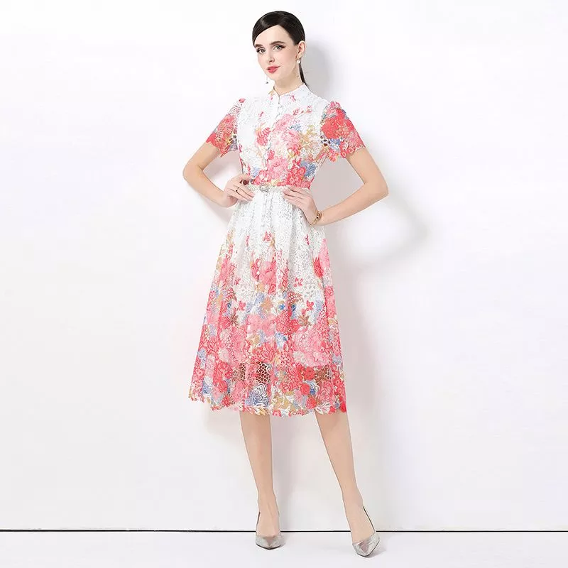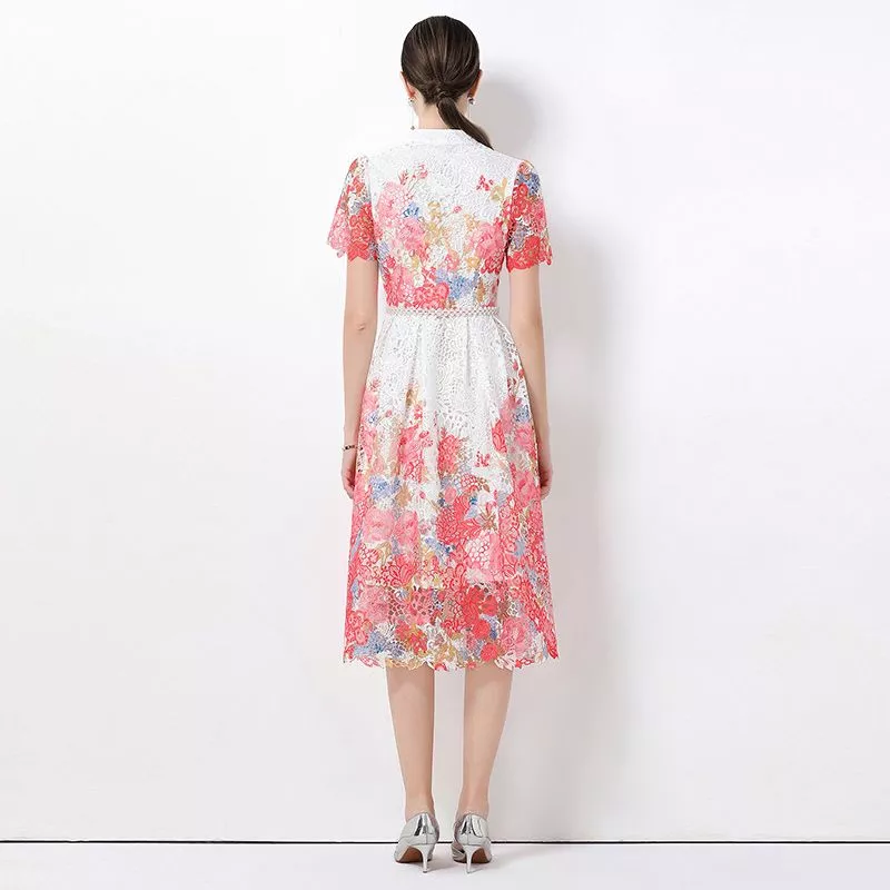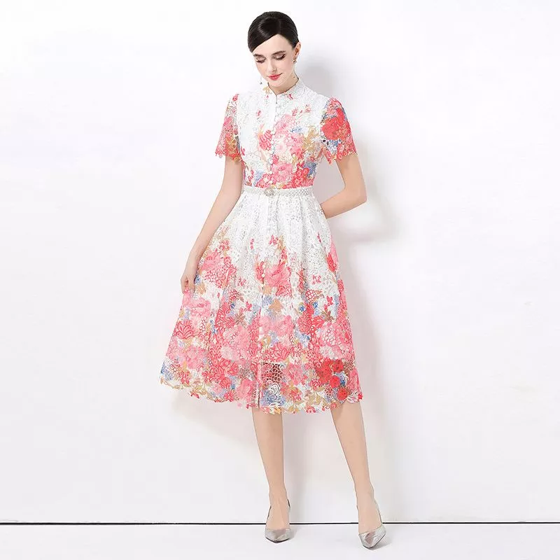 Abito Donna Floreale Elegante Lungo Con Maniche Corte In Pizzo CF63086