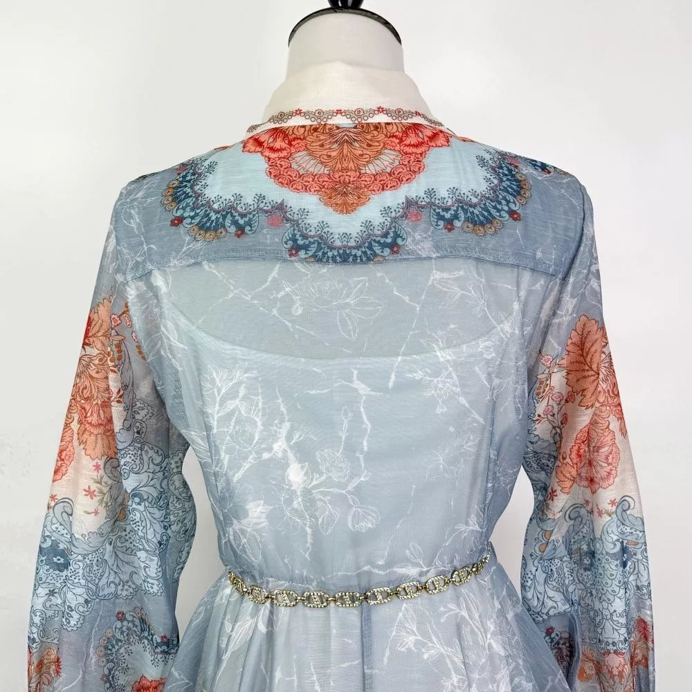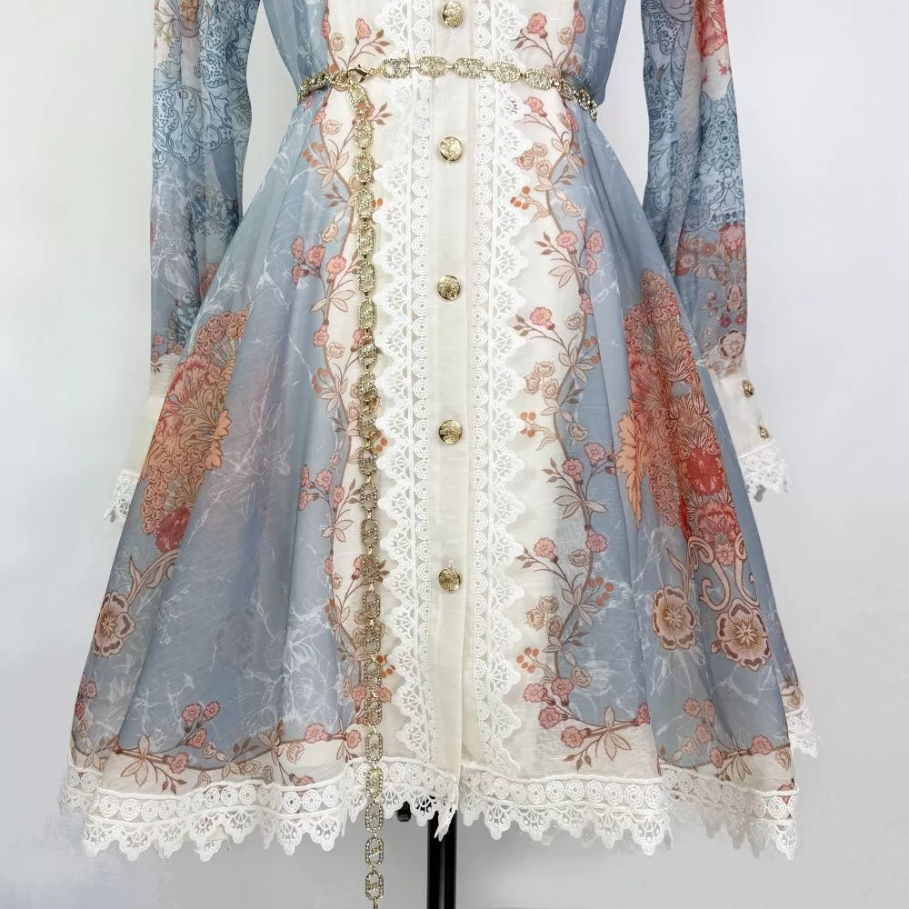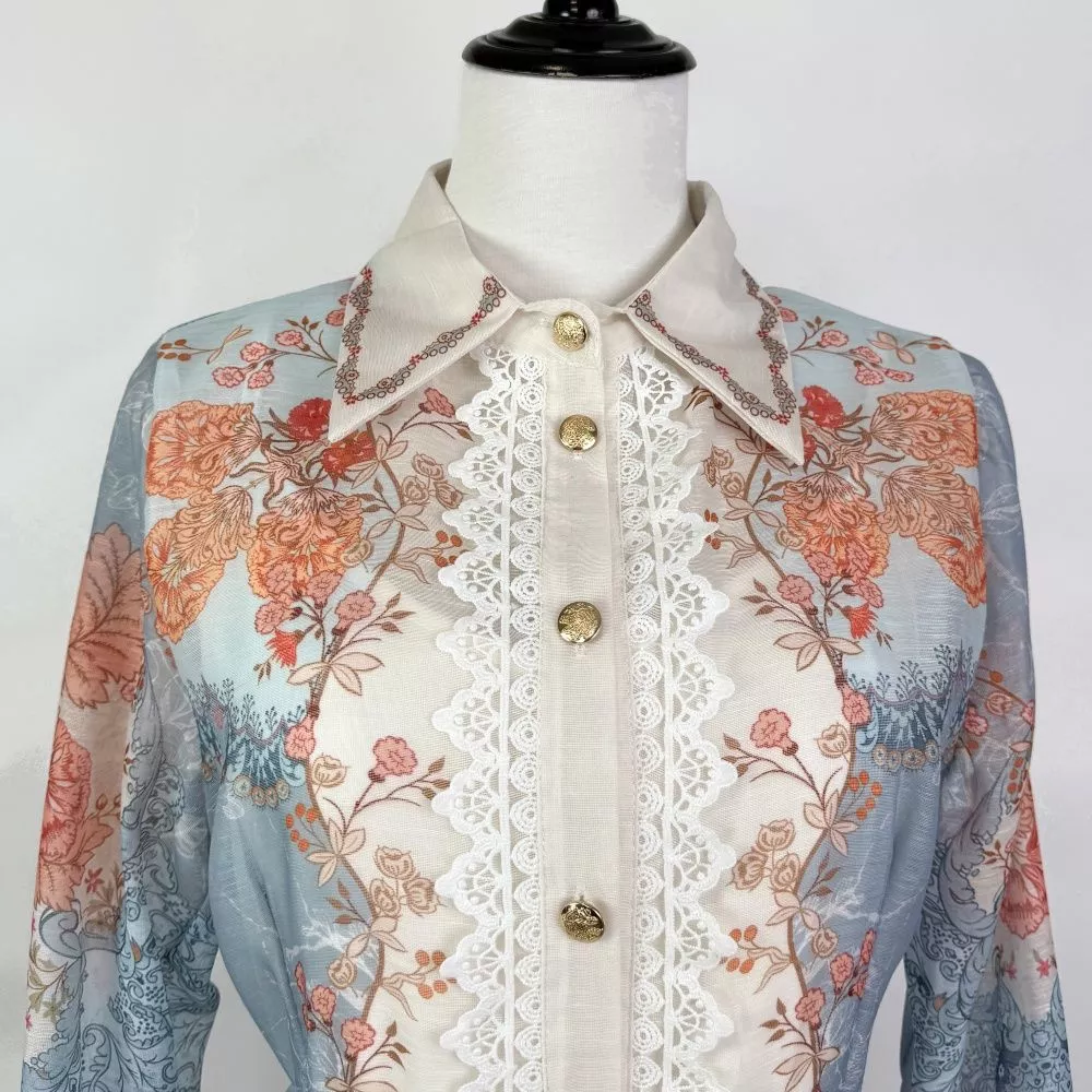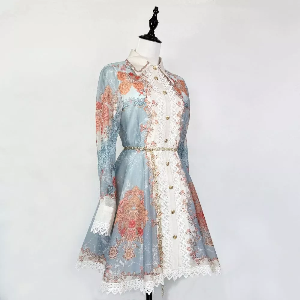 Abito donna floreale dal gusto retrò con lunghezza midi e struttura slanciata. Il modello è caratterizzato da una chiusura frontale con bottoni decorativi e da un inserto centrale in pizzo che attraversa verticalmente il capo, valorizzando la figura.