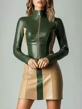 Abito da donna dal carattere deciso e contemporaneo, realizzato in pelle sintetica con elegante contrasto bicolore verde e beige che valorizza la silhouette. Il design presenta una linea aderente che segue le forme con precisione, enfatizzando la figura in modo femminile e moderno.