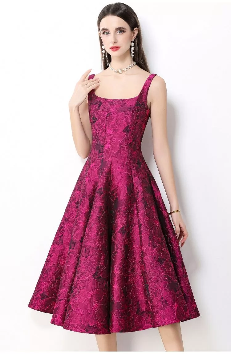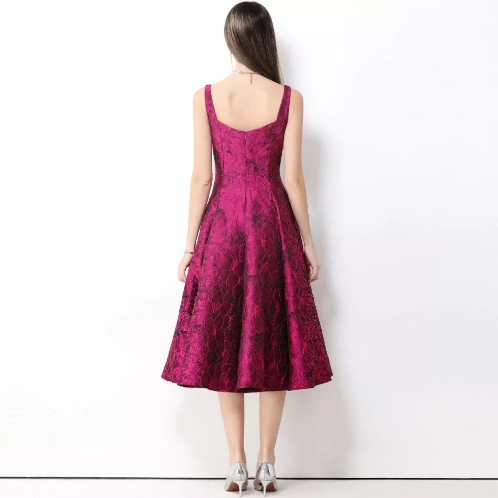 Abito Donna Jacquard Rosa Vino Lungo Con Vita Definita E Gonna Ampia CF66028