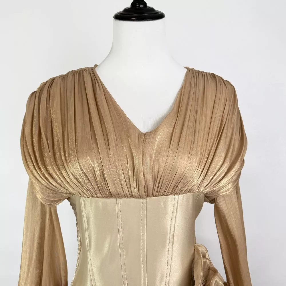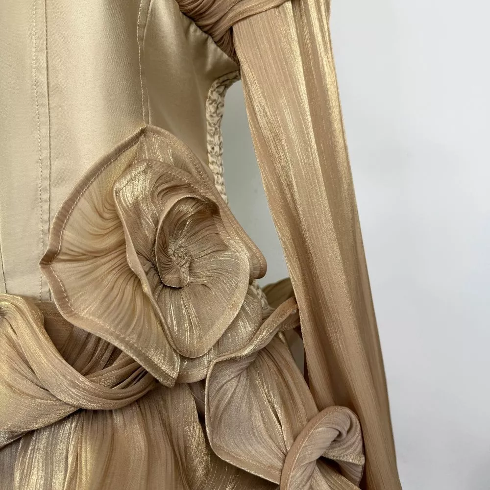 Abito Donna Oro Con Bustier Drappeggiato Balze Eleganti A Maniche Lunghe CF64748