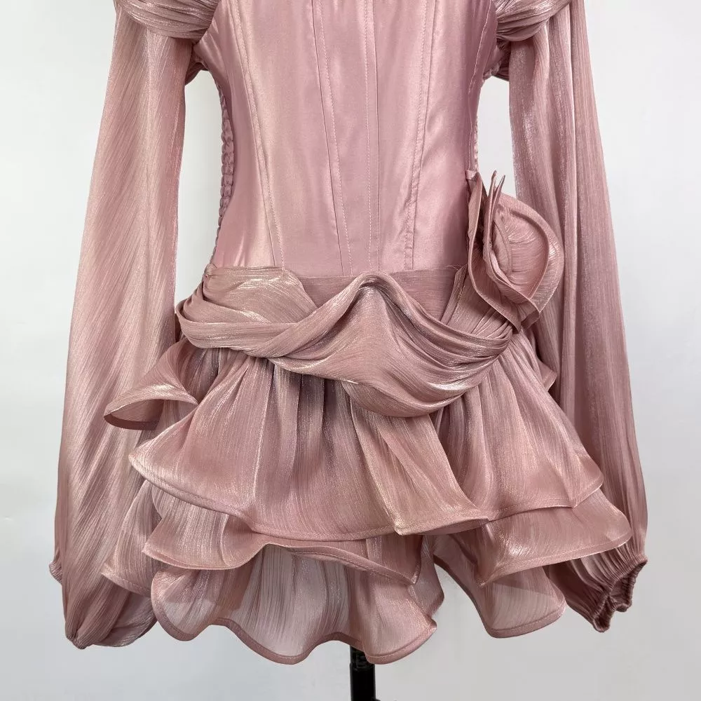 Abito Donna Rosa Bustier Drappeggiato E Balze Eleganti A Maniche Lunghe CF64748