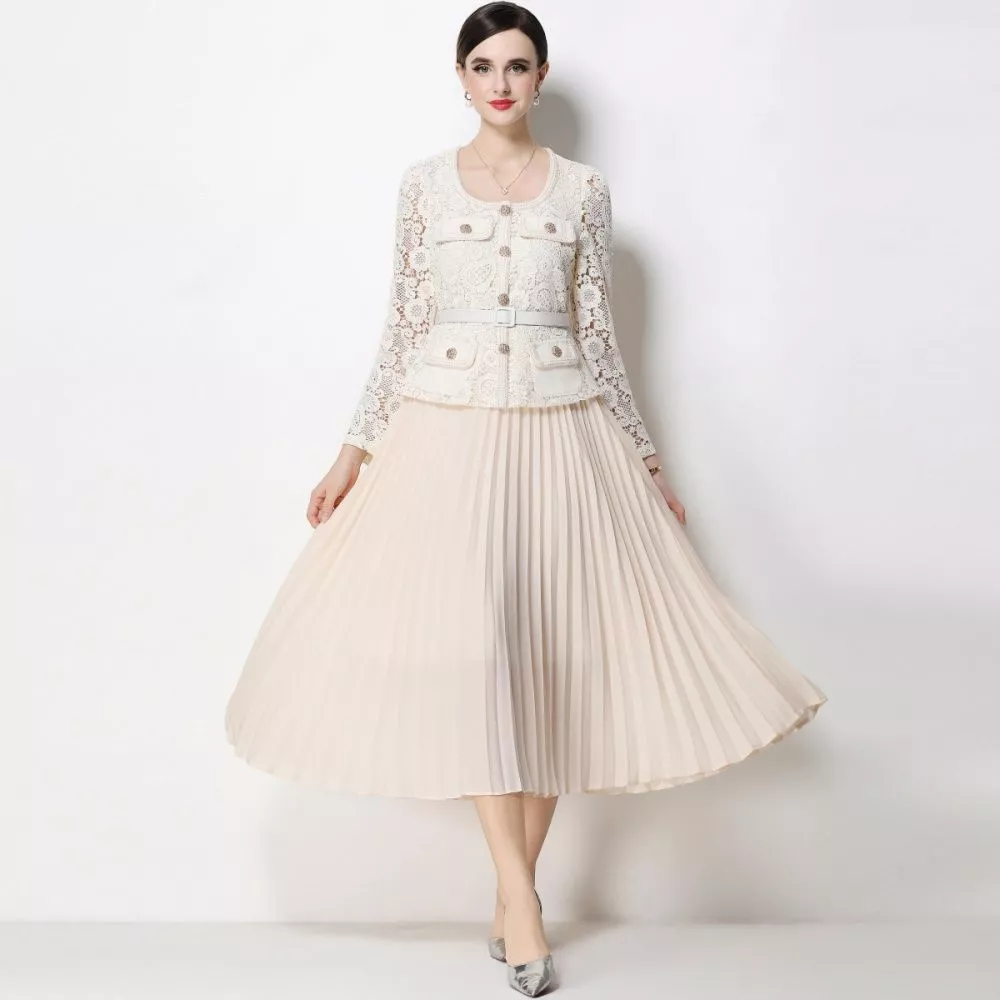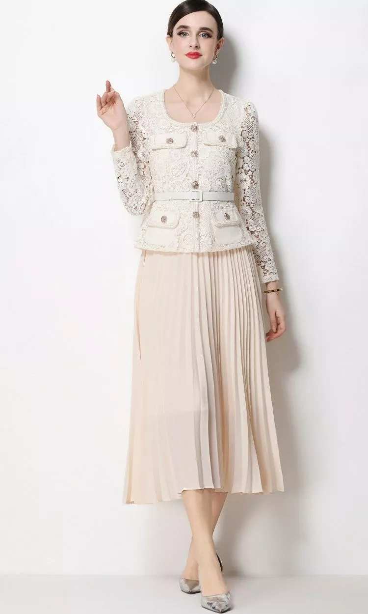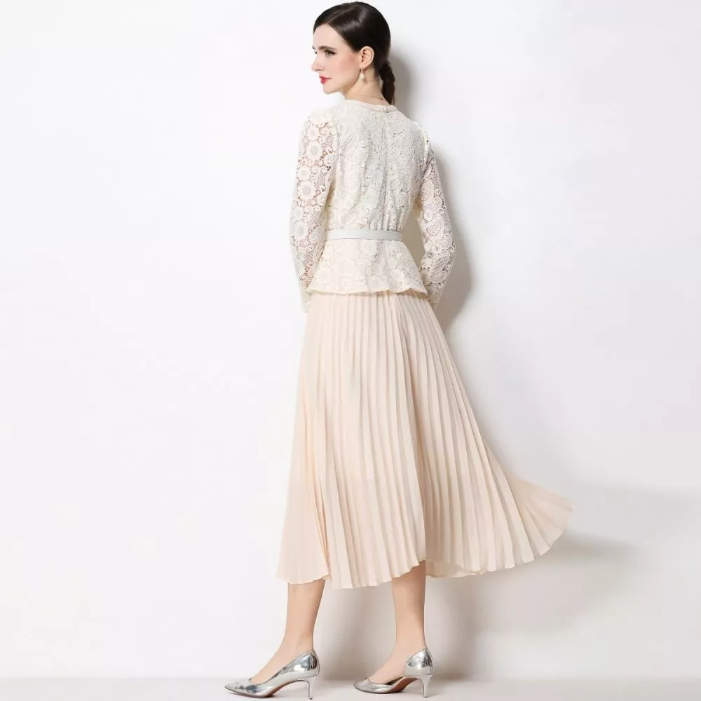 Abito elegante in tonalità beige chiaro, caratterizzato da un corpetto in pizzo lavorato e una gonna midi plissettata che dona movimento e leggerezza. Il design strutturato valorizza la figura con equilibrio e raffinatezza.
