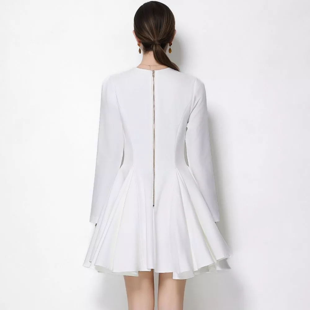 Abito Elegante Bianco Con Gonna Plissettata Bottoni Decorativi Cerimonia CF64913