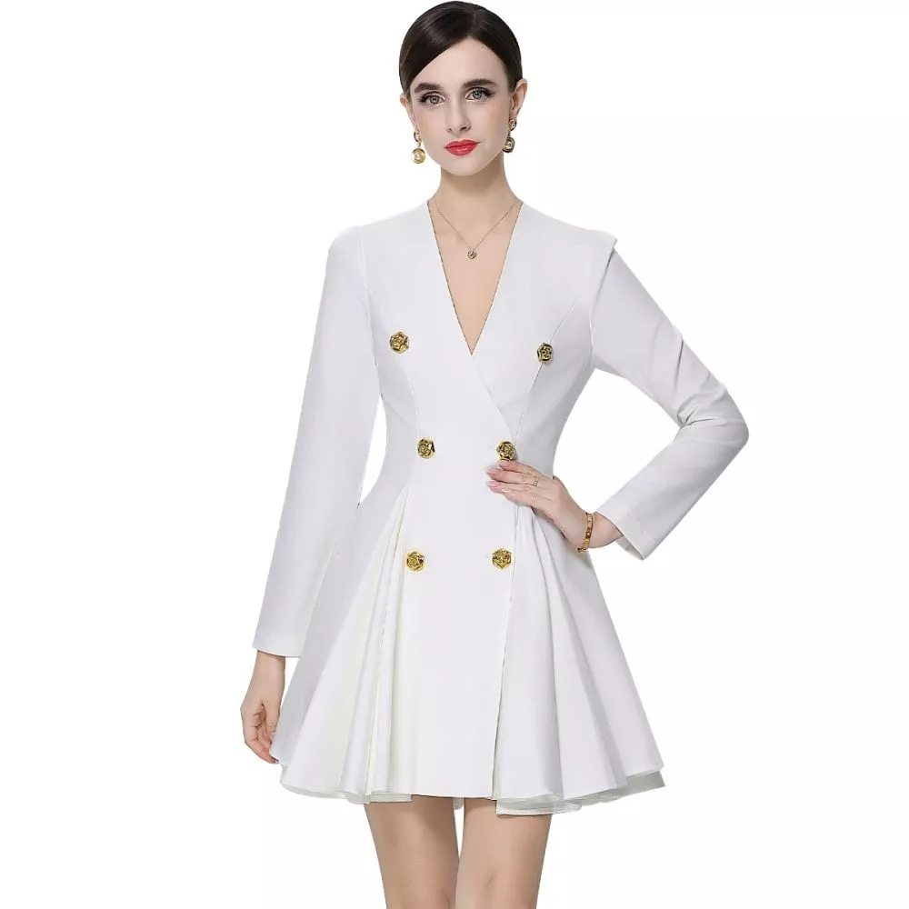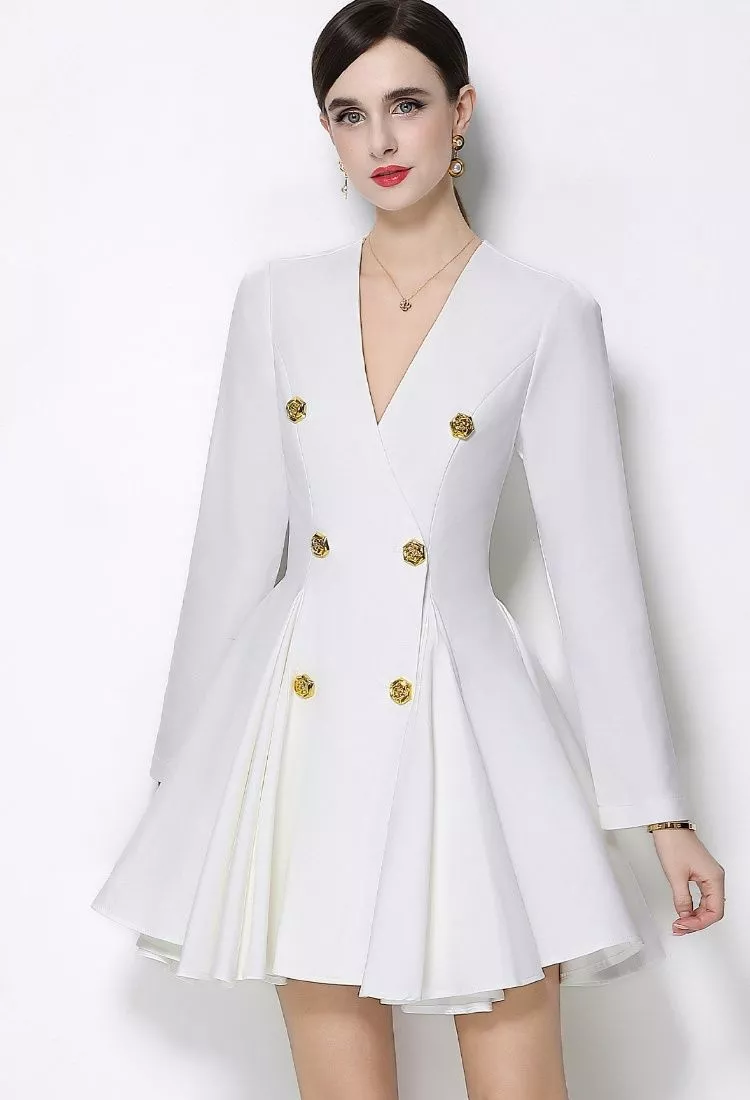 I bottoni decorativi frontali aggiungono un dettaglio raffinato e distintivo, rendendo l’abito adatto a cerimonie, eventi formali e occasioni speciali in cui è richiesto uno stile curato e contemporaneo. Il colore bianco esalta la luminosità del capo, offrendo un’eleganza pulita e senza tempo.