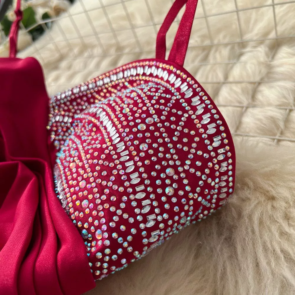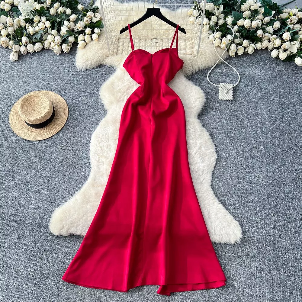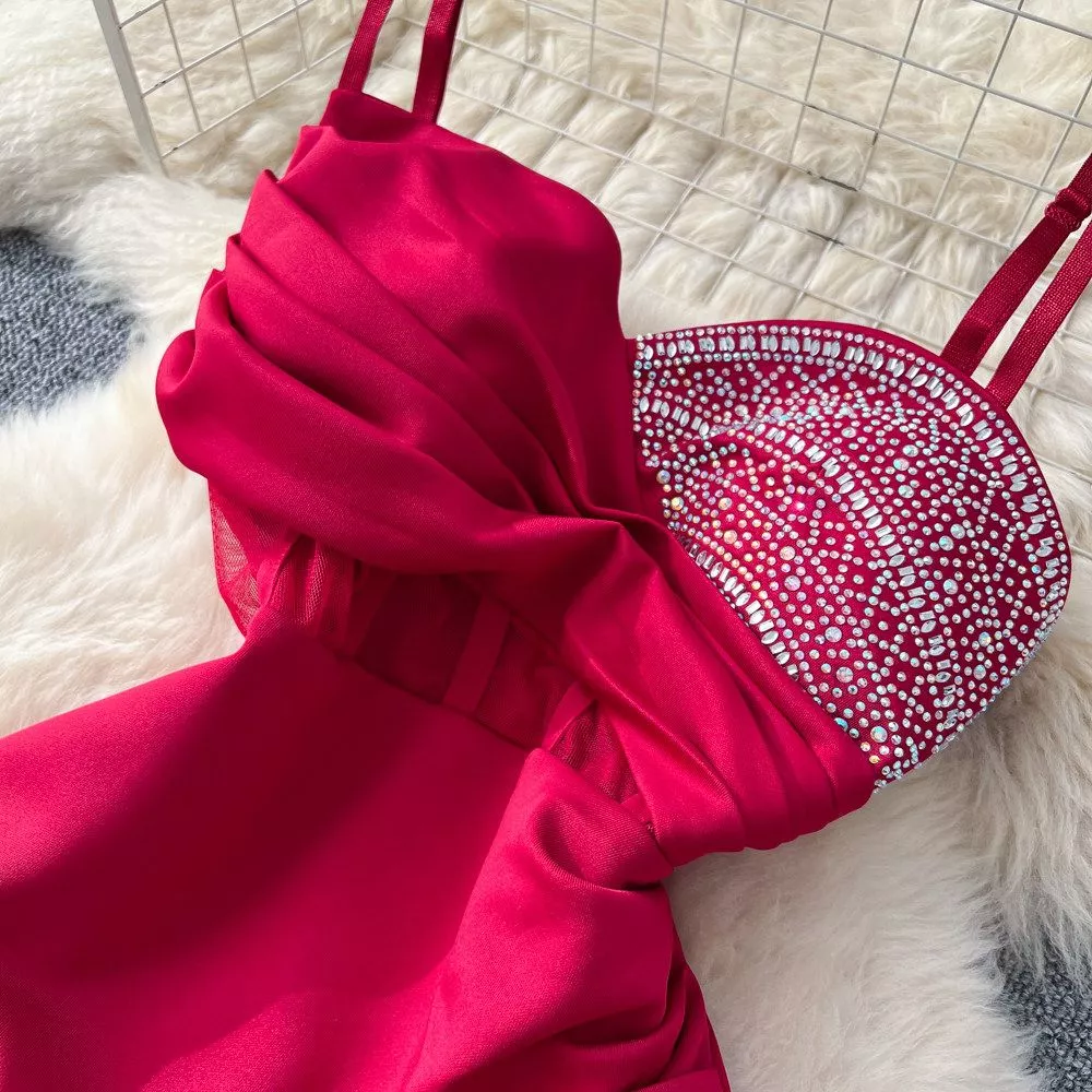 Abito da sera lungo dal design elegante e femminile, caratterizzato da una silhouette fluida che valorizza la figura. Il modello presenta spalline sottili e una coppa strutturata arricchita da dettagli decorativi luminosi, elemento centrale che dona carattere e raffinatezza al capo. La linea è pulita e scorrevole, con caduta morbida sul fondo, ideale per cerimonie, eventi serali e occasioni formali in cui è richiesto un look curato e di forte impatto visivo.