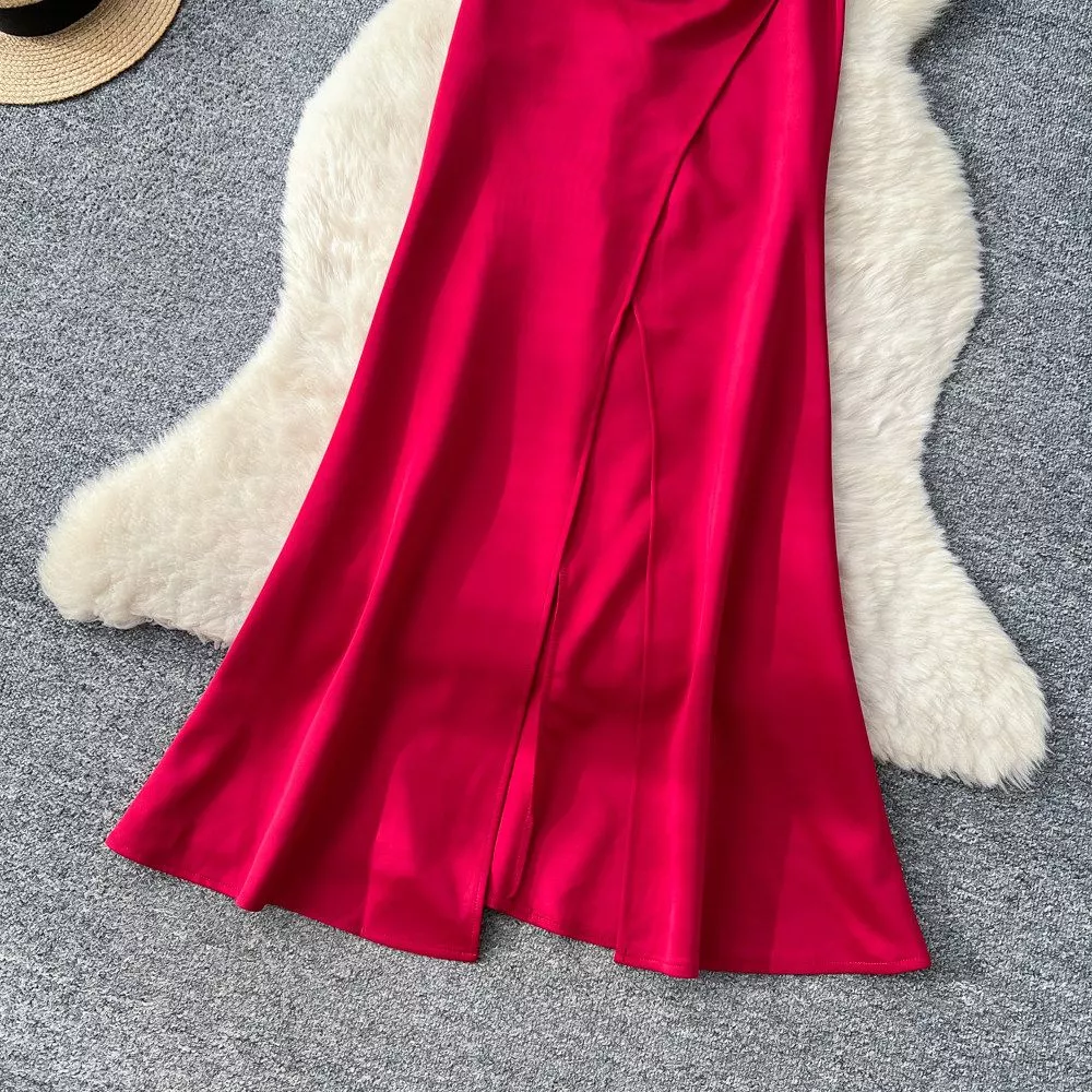 Abito Elegante Da Sera Donna Lungo Coppa Gioiello E Linea Fluida Rosso CF65444