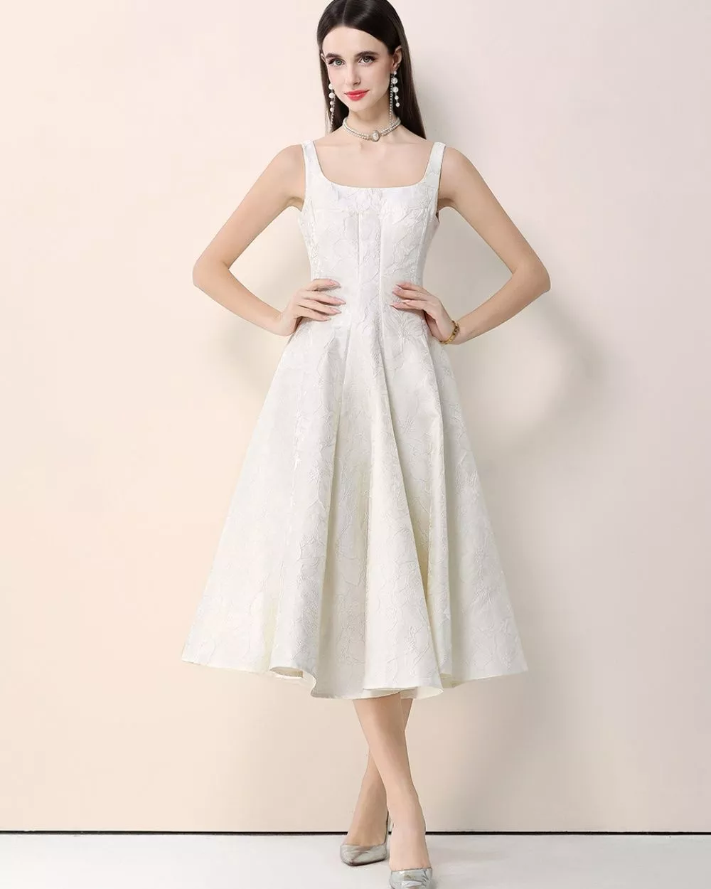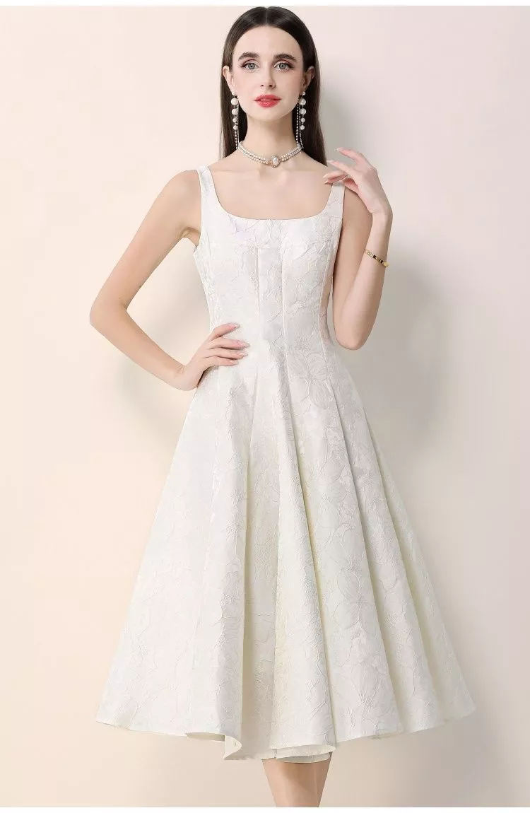 Abito elegante da donna in tonalità albicocca, pensato per valorizzare la silhouette con una linea femminile e armoniosa. Il design retrò con gonna ampia a ruota crea movimento e leggerezza, rendendo questo vestito ideale per cerimonia, eventi, feste e occasioni formali. Il tessuto jacquard dona profondità visiva e un aspetto raffinato, mentre la vestibilità accompagna le forme senza costringere, offrendo comfort e stile in un unico capo.