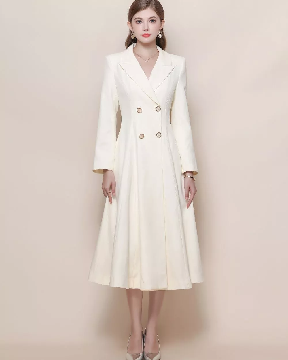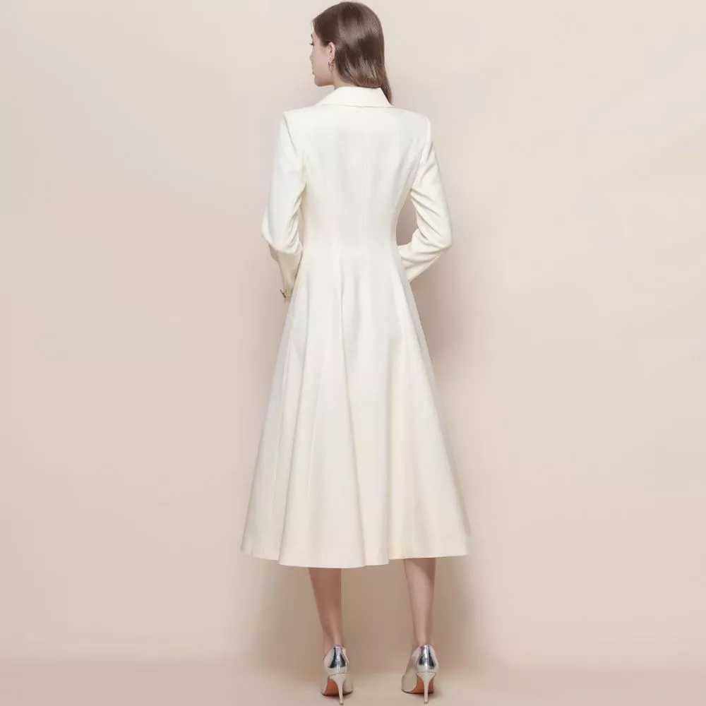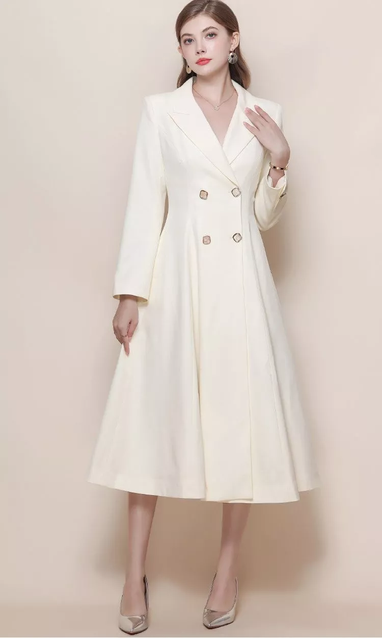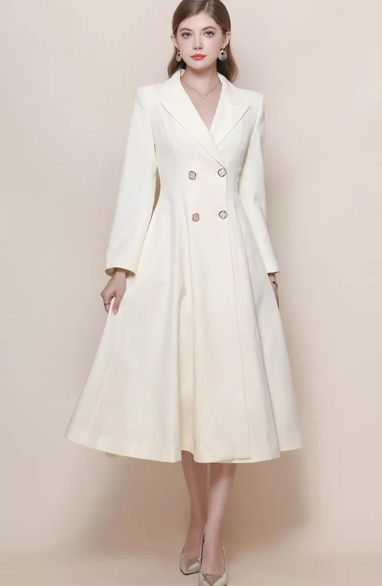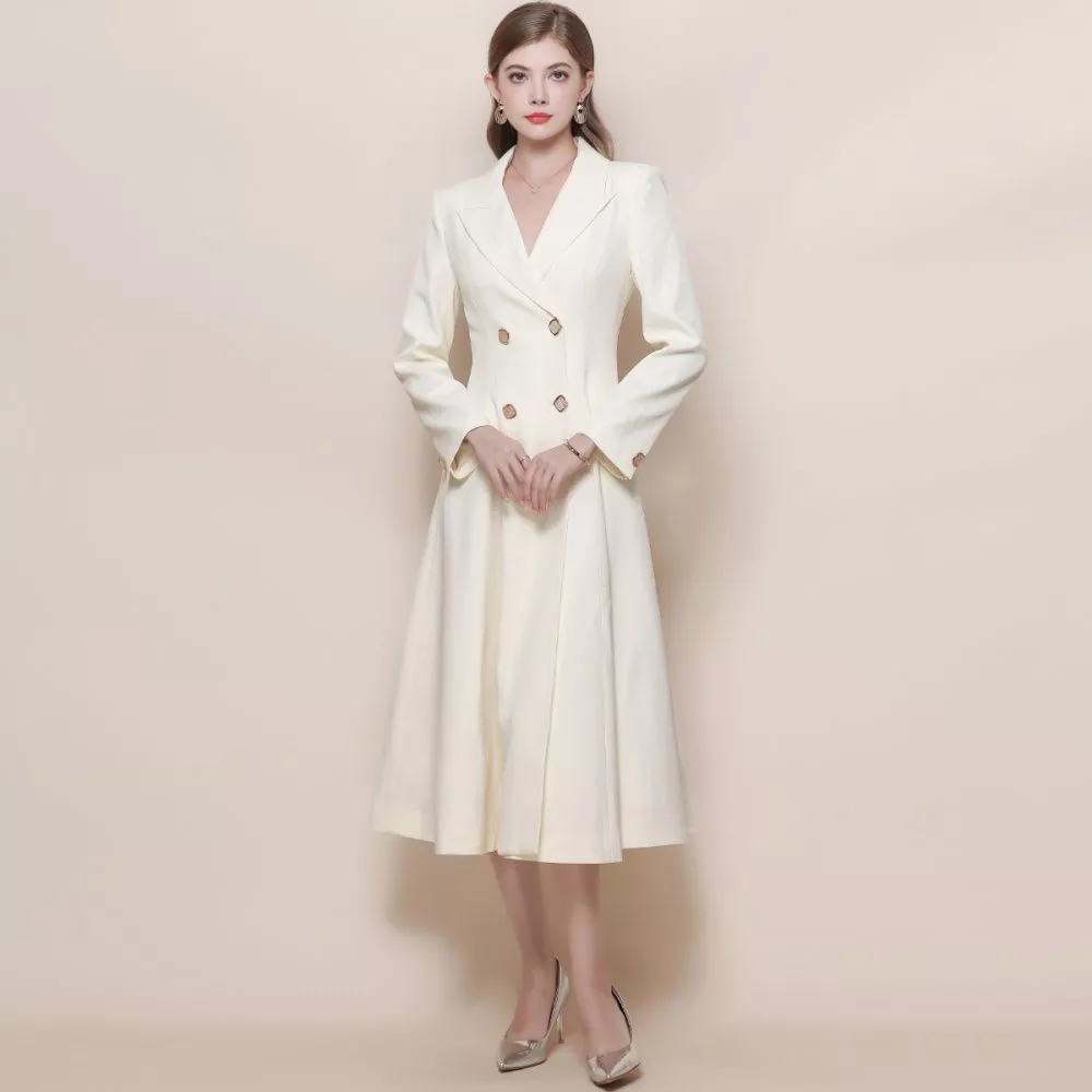 Abito midi doppiopetto in stile francese, elegante e luminoso grazie alla tonalità avorio–albicocca, perfetta per cerimonie, eventi e occasioni raffinate. Il taglio sartoriale con rever definiti valorizza la parte superiore, mentre la gonna svasata crea una linea longuette armoniosa e femminile. Le maniche lunghe e la costruzione strutturata donano un aspetto ricercato, mantenendo un’eleganza sobria. Realizzato in materiale sintetico, conserva bene la forma e garantisce un’ottima resa visiva nelle foto e all’indosso.