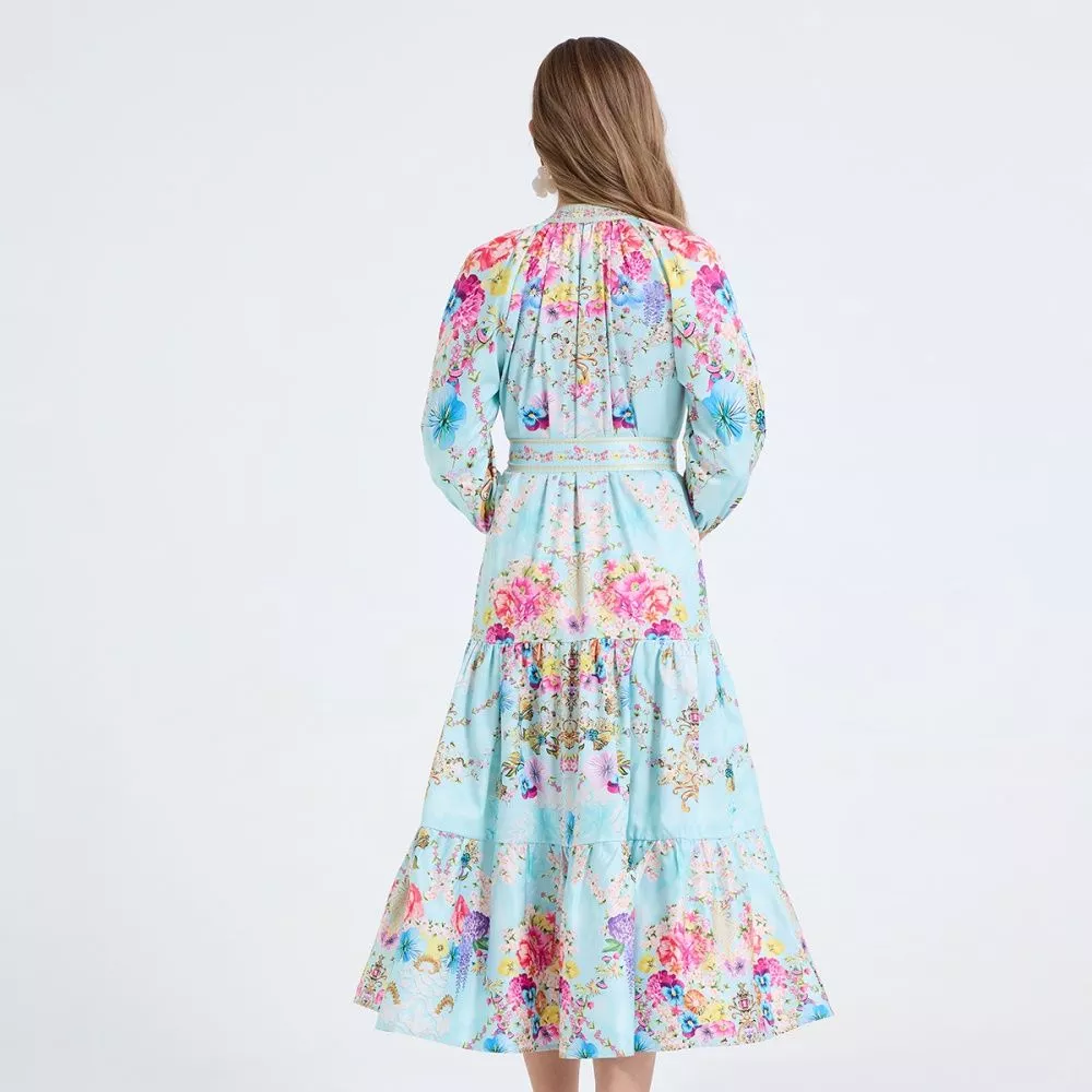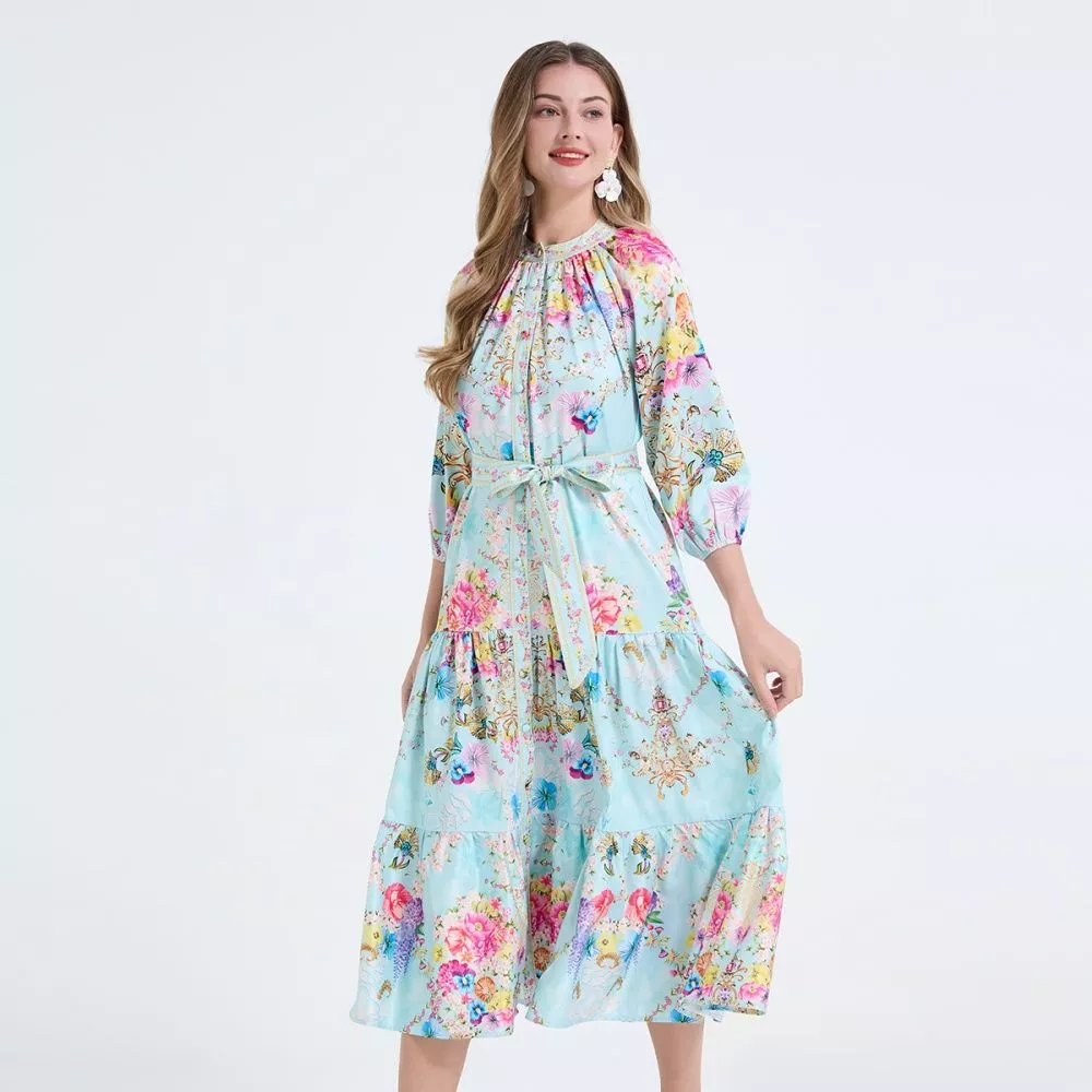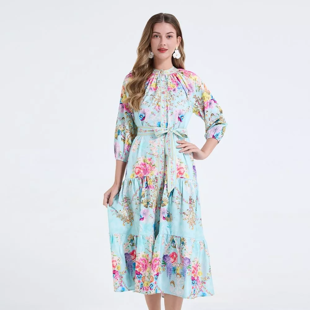 Abito Elegante Stampato Azzurro Floreale Con Cintura E Maniche Lunghe CF64909
