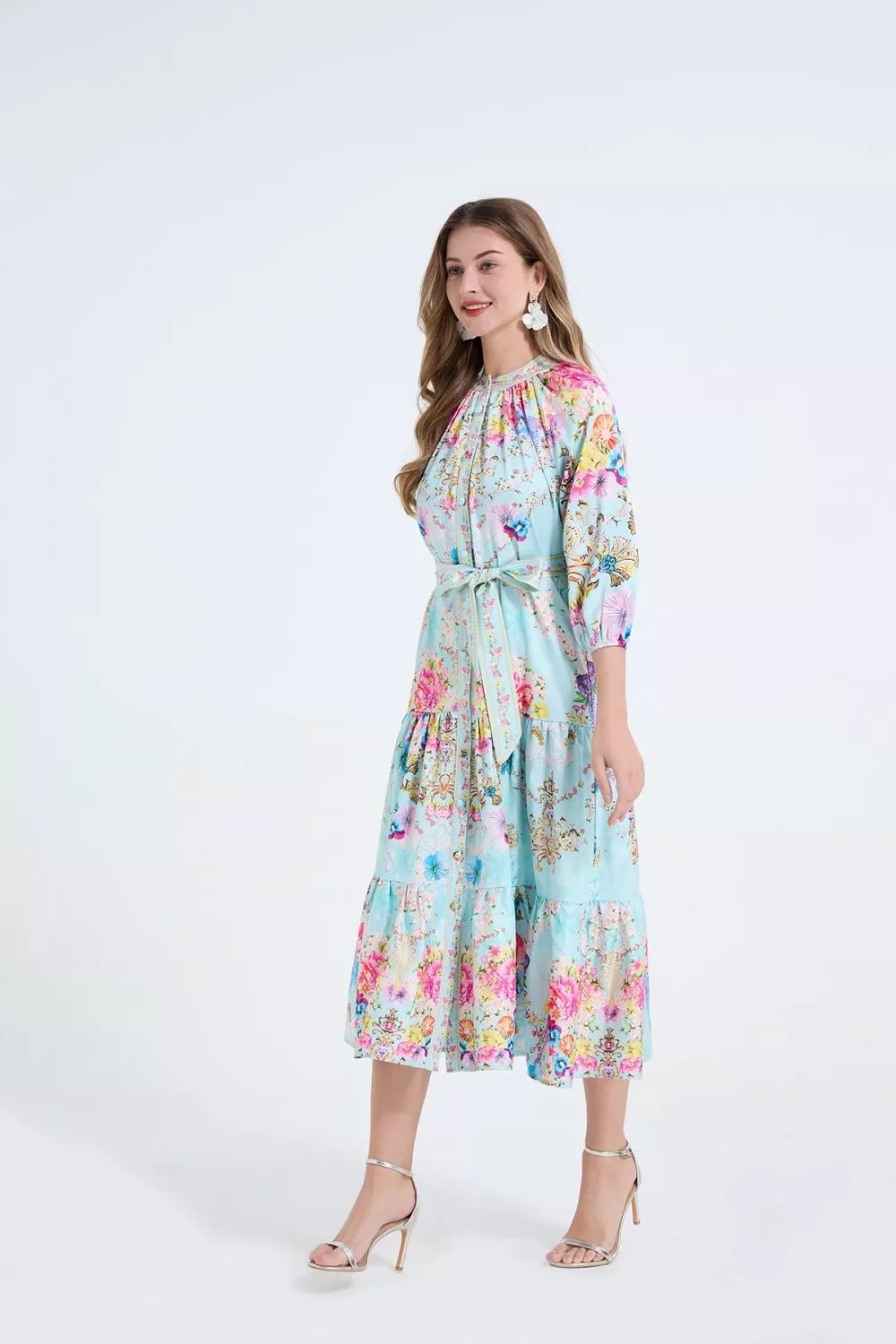 Abito elegante stampato dal gusto raffinato e femminile, caratterizzato da una fantasia floreale multicolore su base azzurro chiaro che dona luminosità e freschezza all’insieme. Il design a vita segnata valorizza la silhouette in modo naturale, mantenendo una linea equilibrata e armoniosa.
