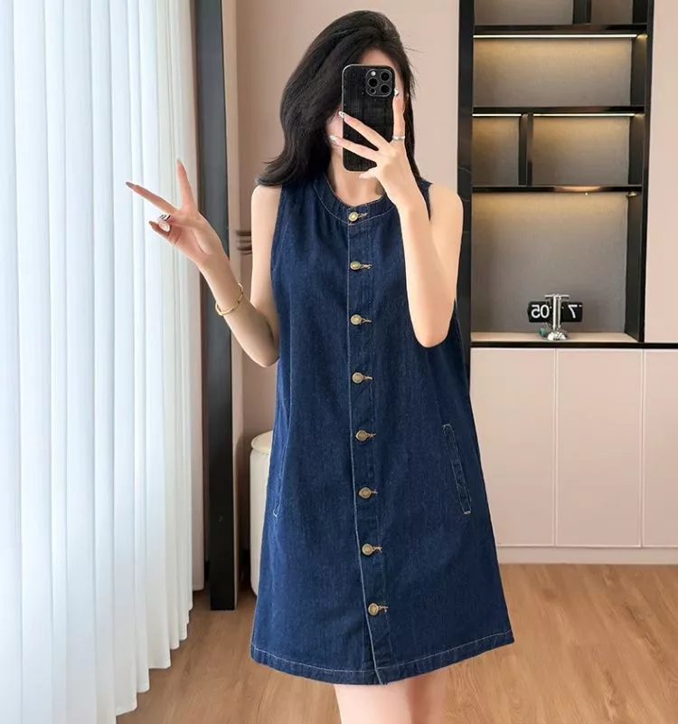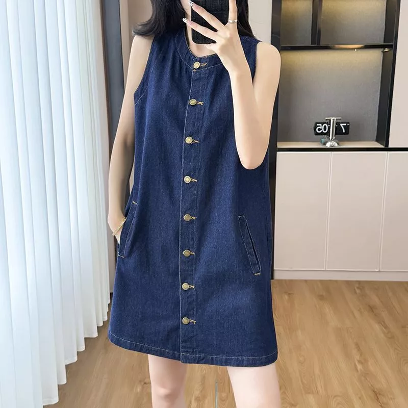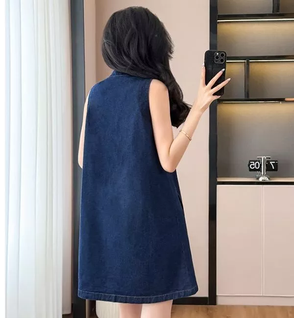 Scopri il fascino senza tempo del denim con questo abito gilet blu marino, ideale per la stagione calda. Il design senza maniche lo rende perfetto da indossare da solo o con una t-shirt basica sotto per un look a strati. Il taglio dritto dona comfort e libertà di movimento, mentre la chiusura frontale con bottoni metallici e le due tasche laterali aggiungono un tocco pratico e casual-chic. Uno stile semplice ma d’effetto, ideale per la città o il tempo libero.