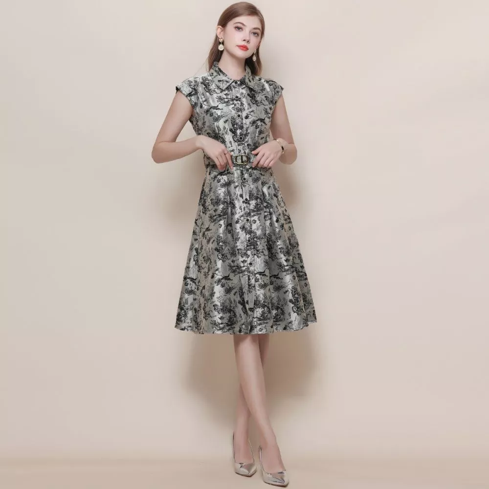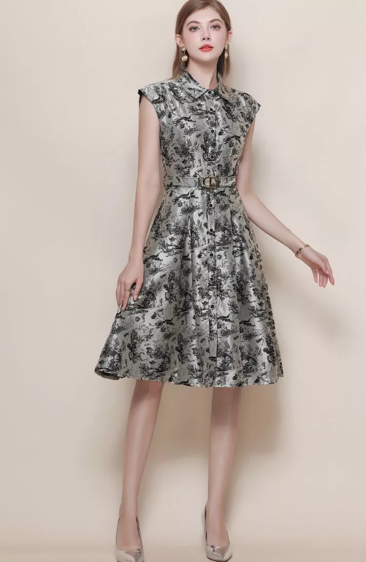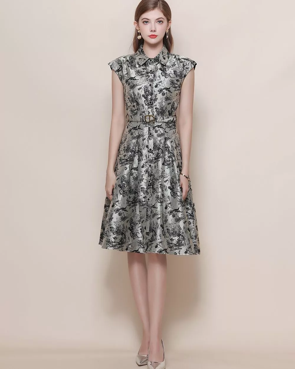 Il punto vita è sottolineato da una cintura coordinata con fibbia decorativa che valorizza la figura, mentre la gonna svasata conferisce movimento e leggerezza.