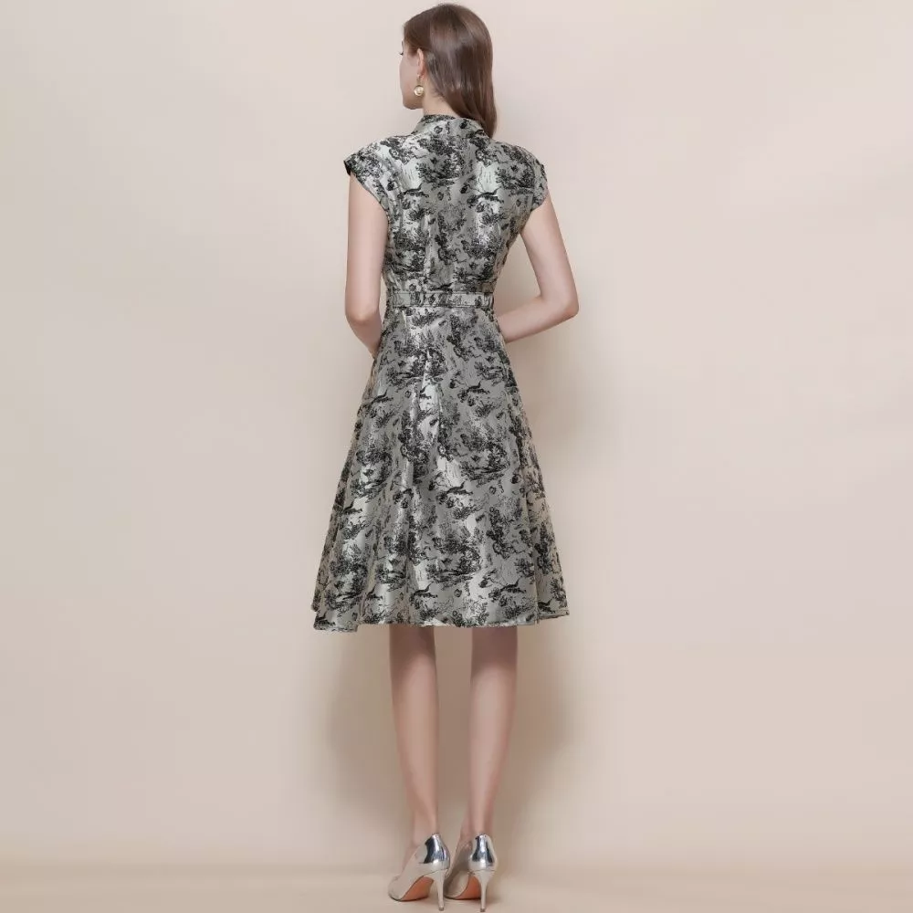 Abito Grigio Fantasia Elegante Con Cintura In Vita E Gonna Svasata Midi CF57617