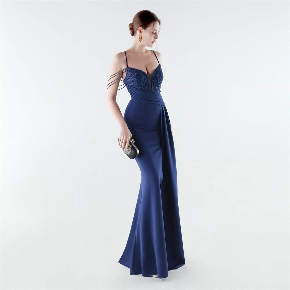 Vestito lungo elegante con spalline sottili e linea sirena che valorizza la silhouette. Il corpetto strutturato con inserti decorativi sostiene e definisce il busto, mentre lo spacco laterale slancia la figura donando un effetto sofisticato. La schiena con intreccio regolabile aggiunge un dettaglio raffinato e sensuale. Perfetto per cerimonie, gala, eventi serali e occasioni speciali.