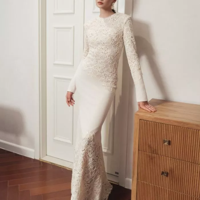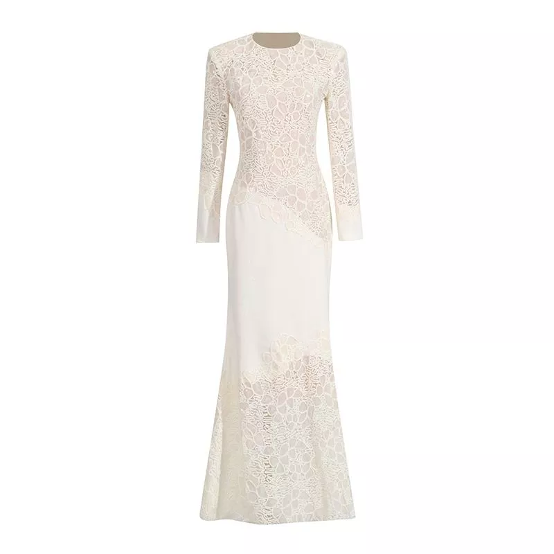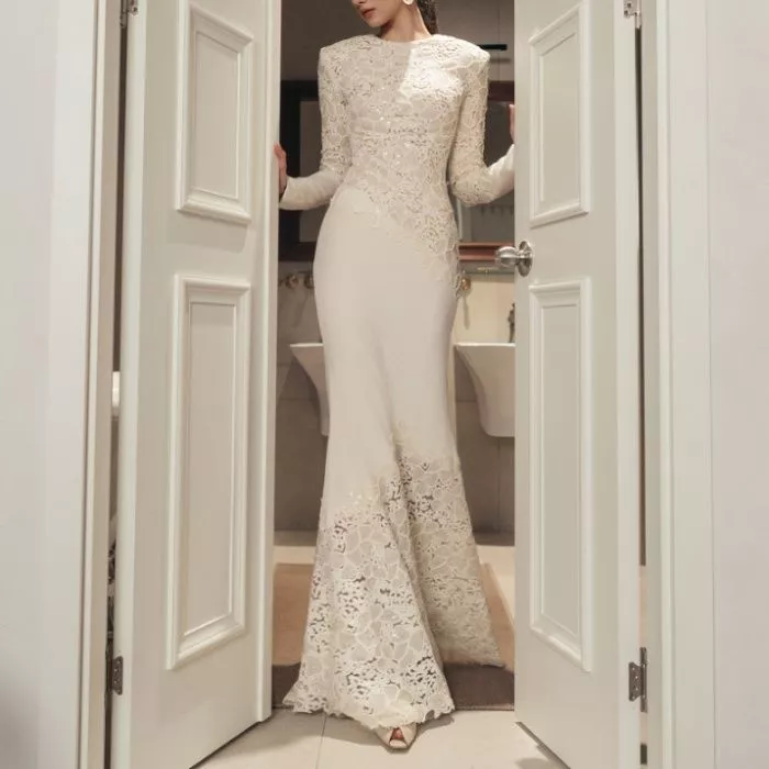 Abito lungo elegante in stile sirena, caratterizzato da un ricamo raffinato che avvolge busto, maniche e parte inferiore della gonna. La linea aderente slancia la figura e mette in risalto il punto vita, mentre la lavorazione ricamata crea un effetto sofisticato e di grande impatto visivo.