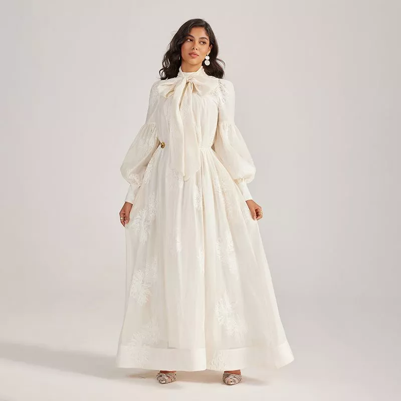 Abito Lungo Bianco Con Fiocco Maxi E Maniche Ampie Elegante CF55506