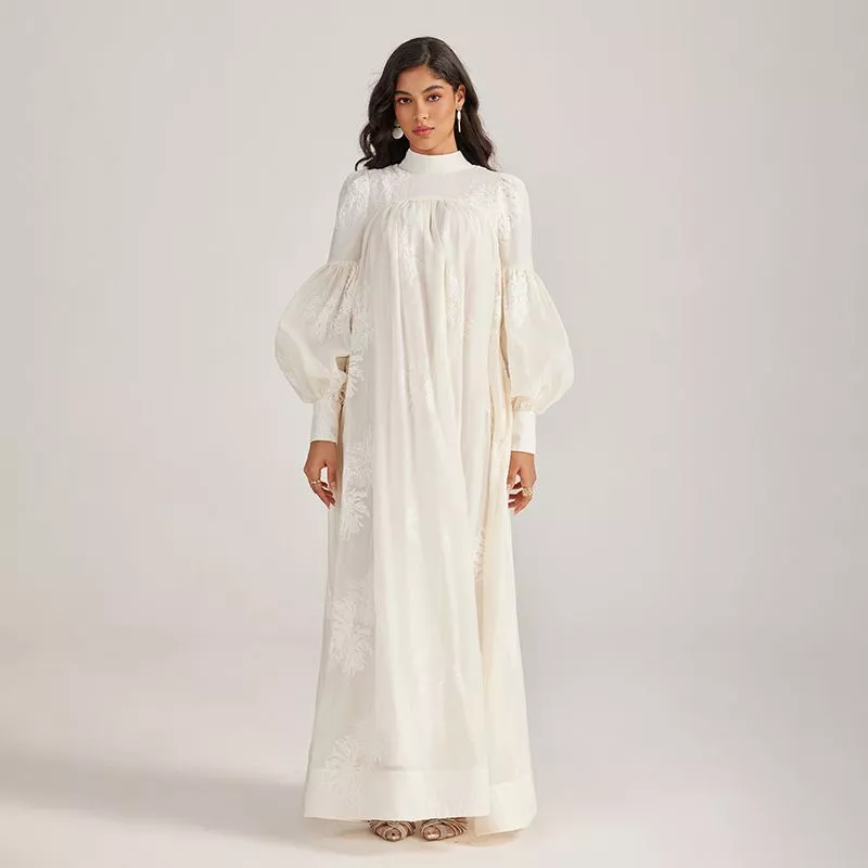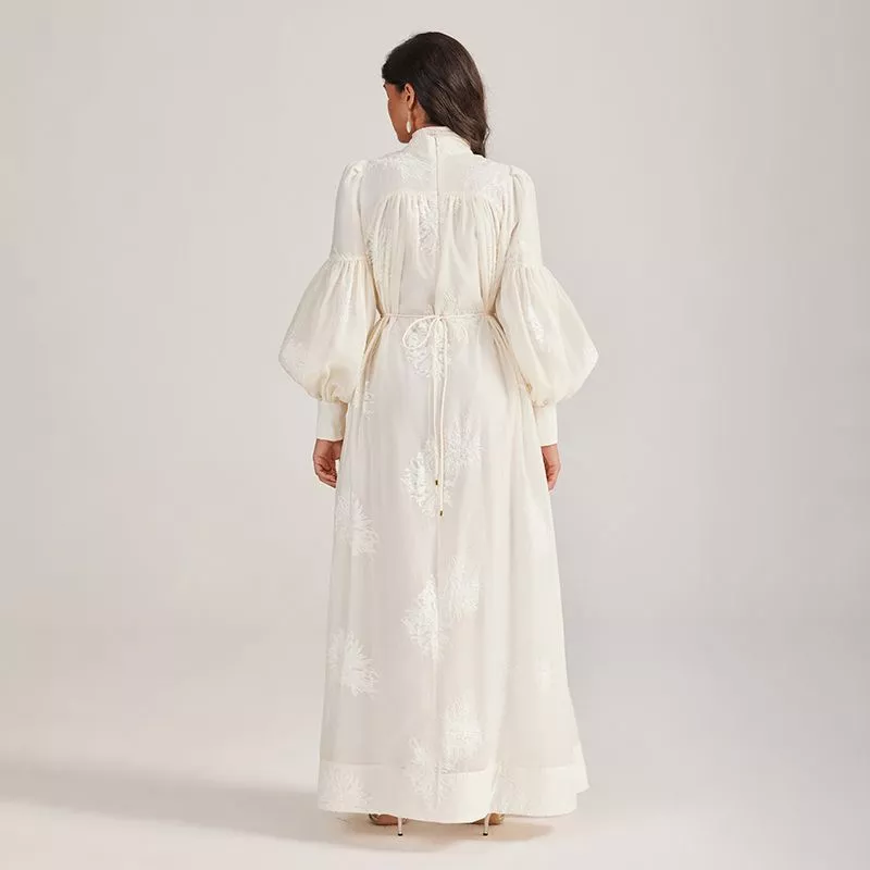 Abito lungo dallo stile raffinato con maxi fiocco frontale e maniche ampie a sbuffo che donano un volume scenografico e romantico.