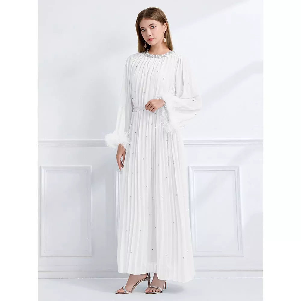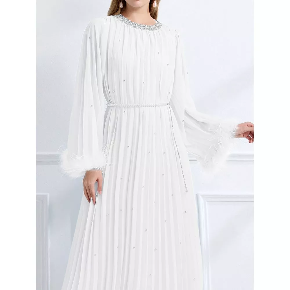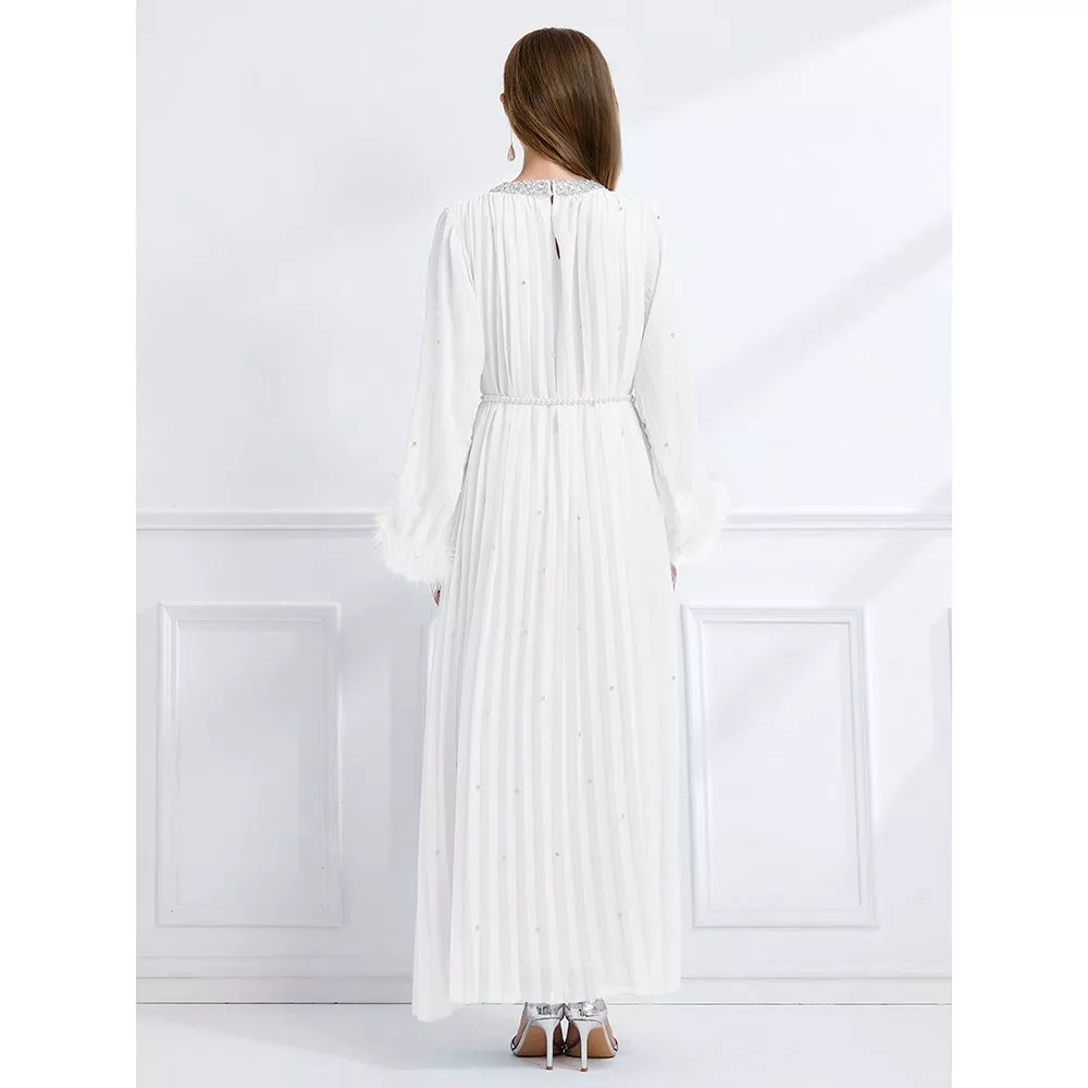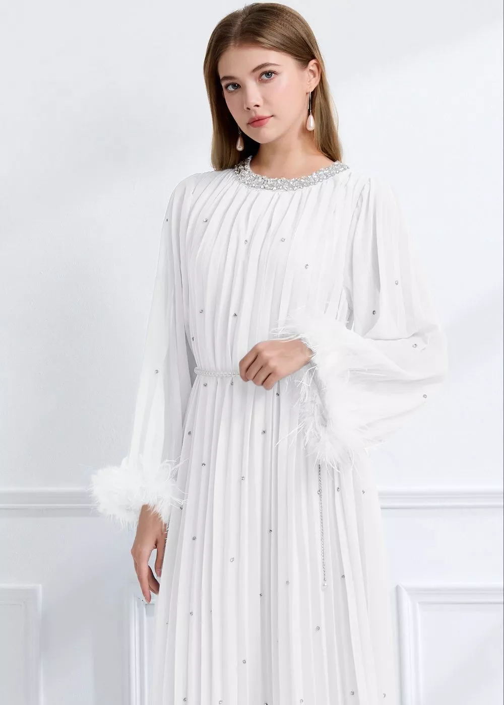 Abito lungo bianco in stile cerimonia, caratterizzato da pieghe plissettate leggere, dettagli di piume soffici ai polsini e strass luminosi che impreziosiscono il girocollo.
