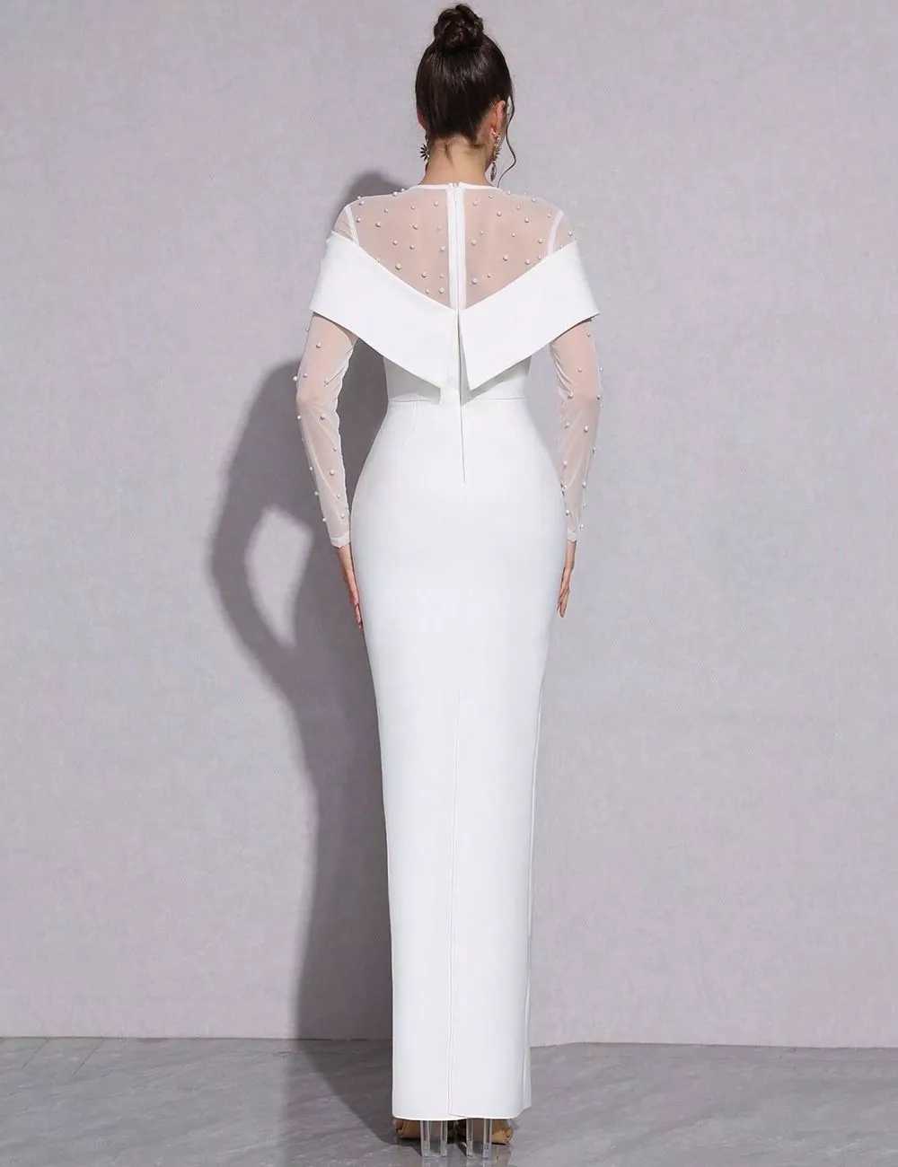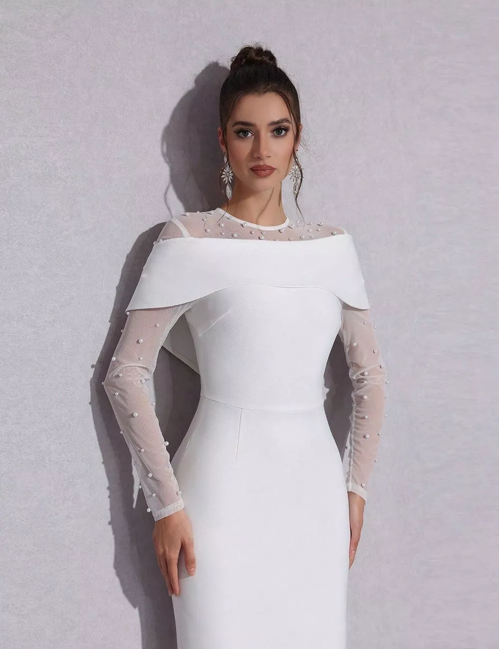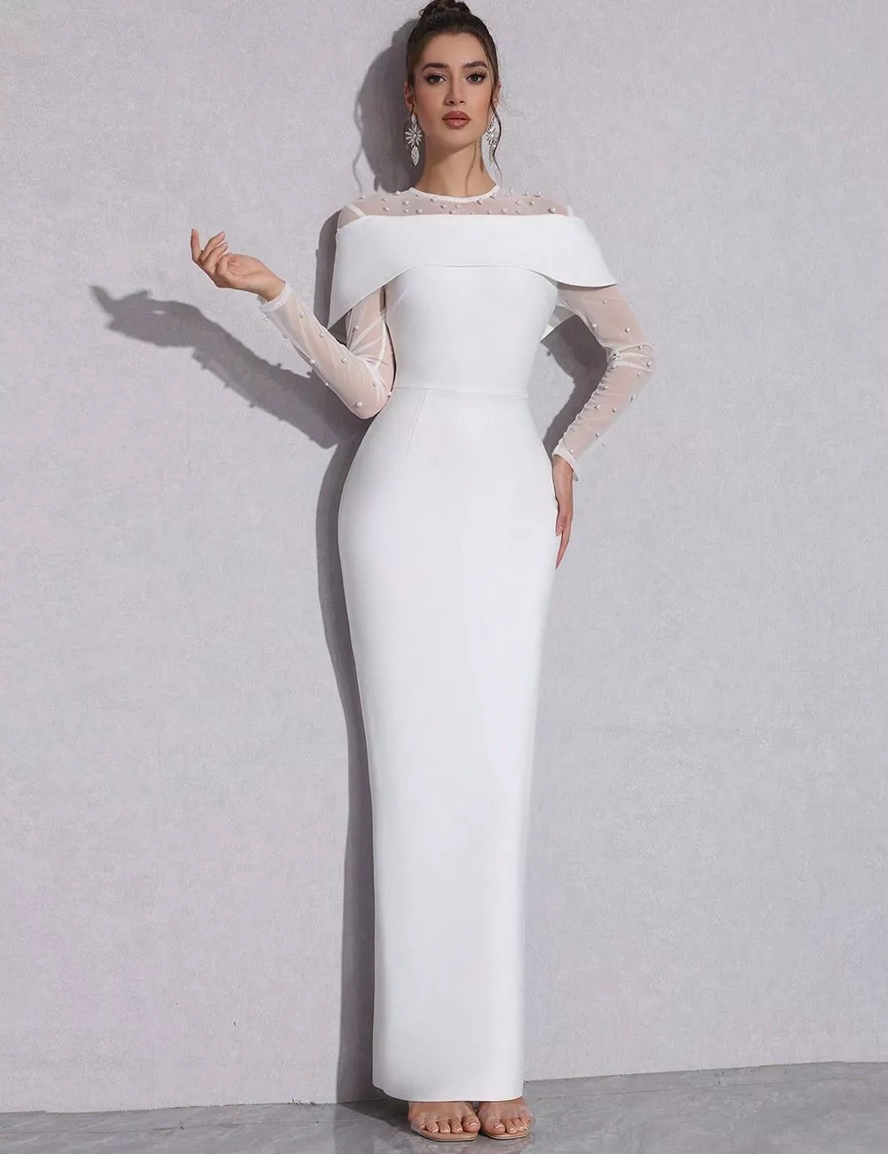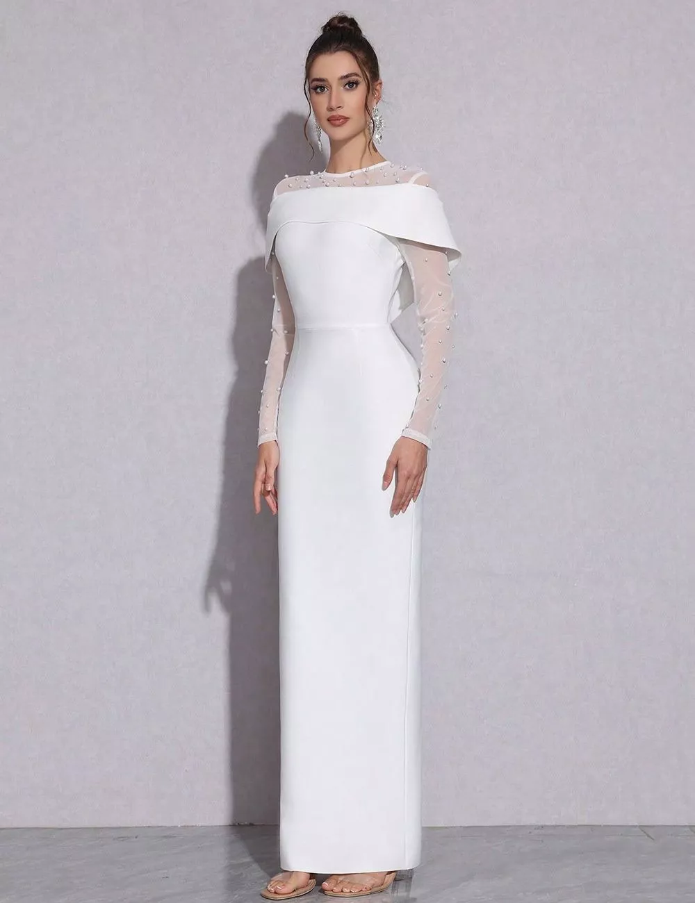 Abito lungo bianco dal fascino estremamente elegante, pensato per cerimonie, eventi serali e occasioni speciali in cui serve un look impeccabile. La linea slanciata valorizza la silhouette, mentre la parte superiore unisce un inserto velato con applicazioni di perle che aggiungono luminosità e carattere senza esagerare. Le maniche velate con dettagli a perla creano un effetto raffinato e delicato, mantenendo un’estetica moderna e sofisticata.