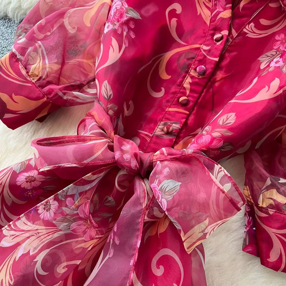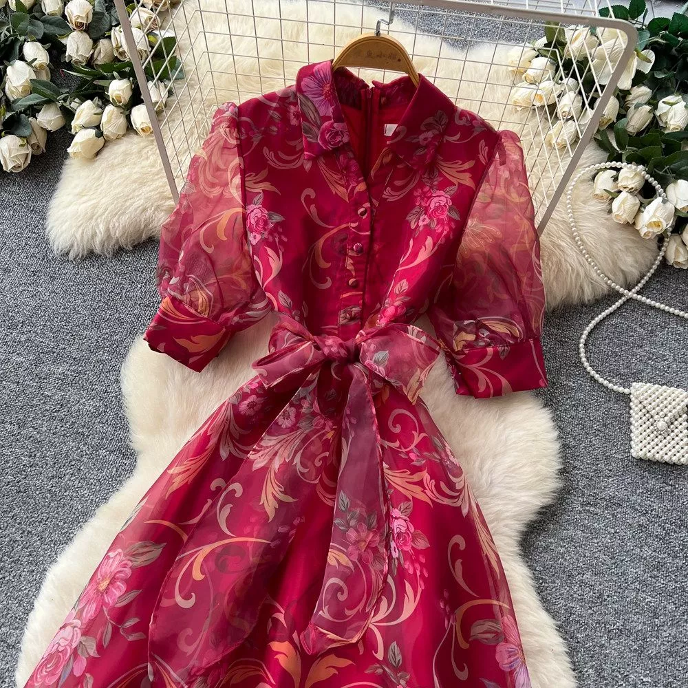 Abito Lungo Cerimonia Donna Floreale Con Cintura Elegante Rosso CF67775