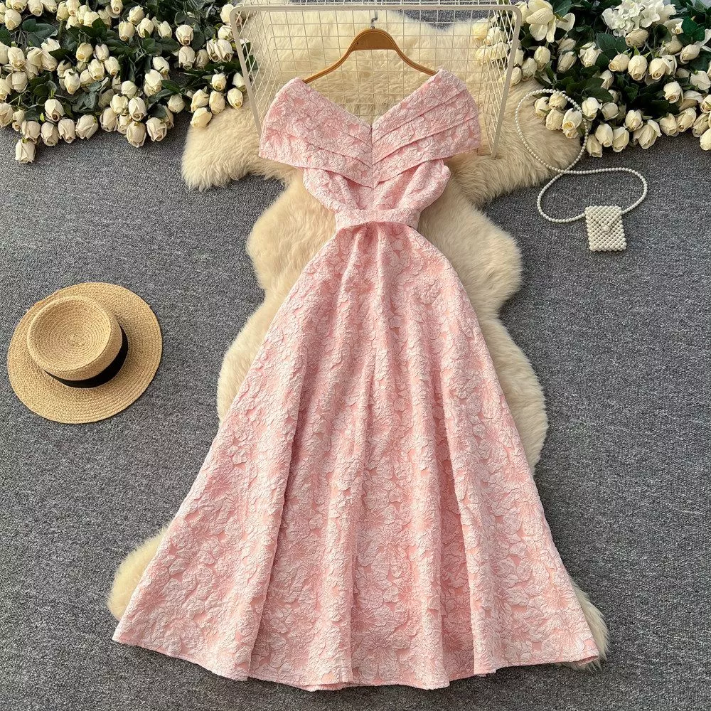 La scollatura drappeggiata con effetto spalle scese crea un taglio romantico e sofisticato, mentre la cintura con fibbia gioiello definisce il punto vita esaltando la silhouette. La gonna ampia a ruota accompagna il movimento con eleganza, rendendo questo vestito ideale per eventi formali, feste eleganti e cerimonie.