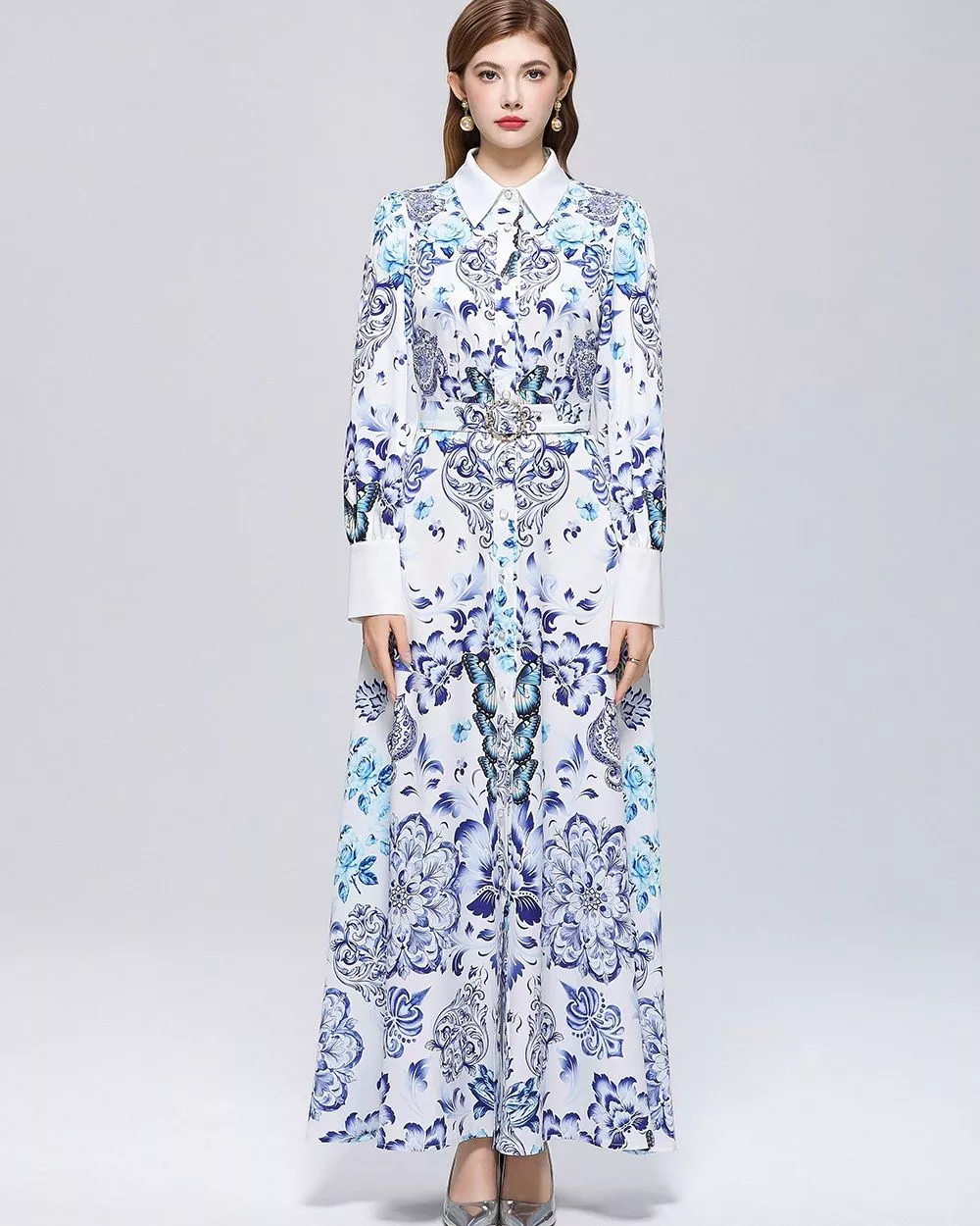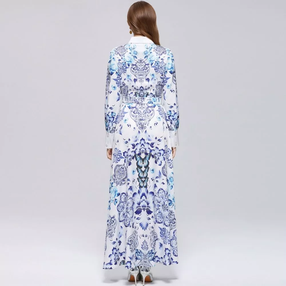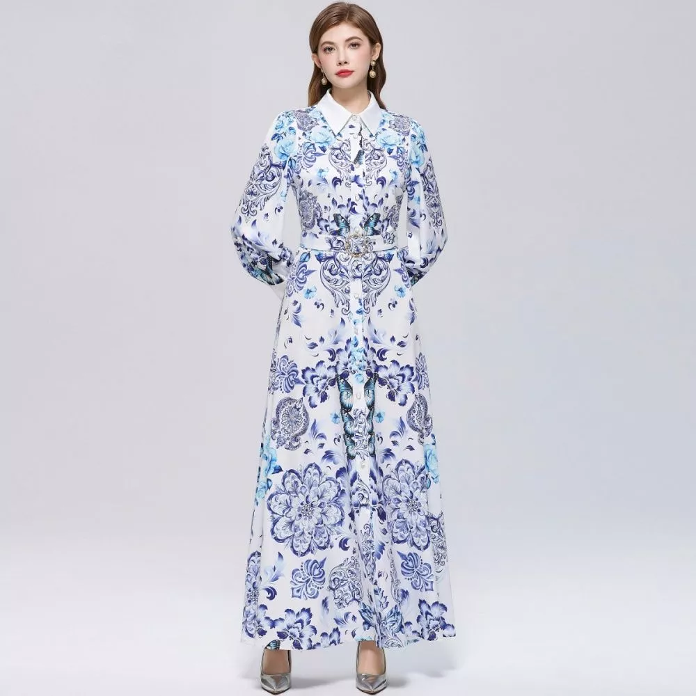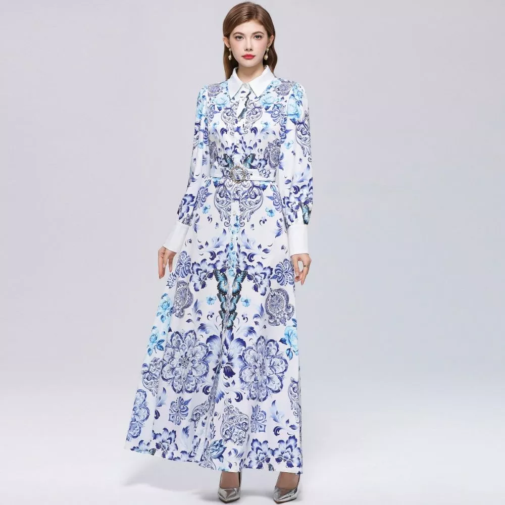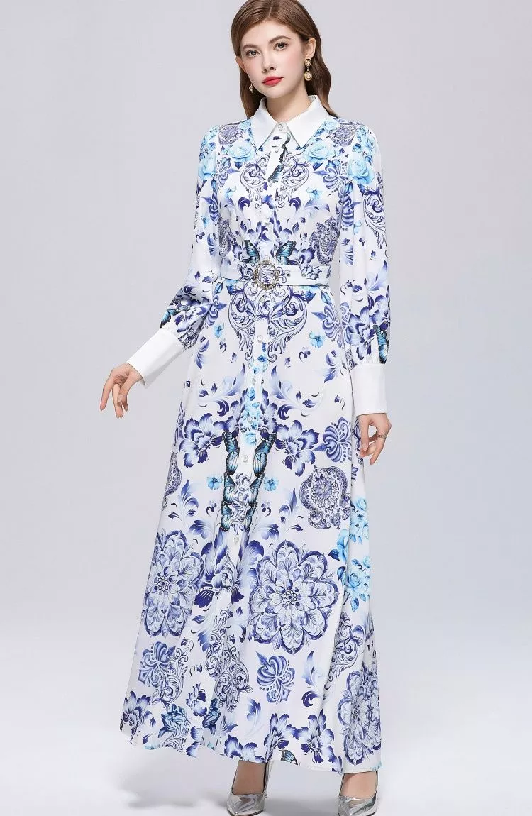 Vestito lungo elegante caratterizzato da una raffinata stampa floreale nei toni del blu su base chiara, capace di creare un effetto visivo sofisticato e immediatamente riconoscibile.