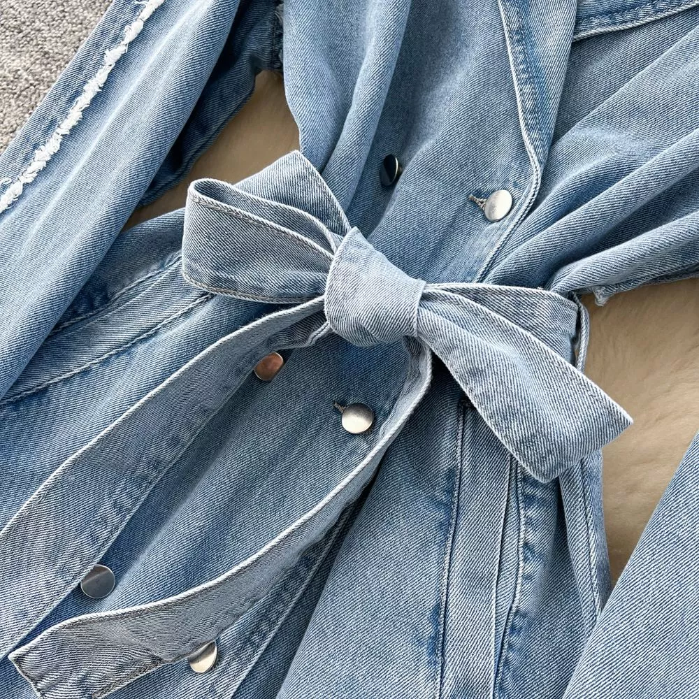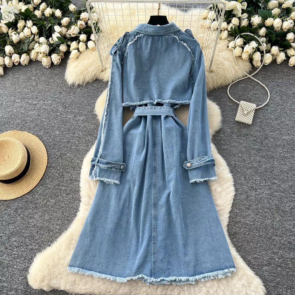 Abito Lungo Denim Sfrangiato Con Cintura Stile Trench Blu CF61276