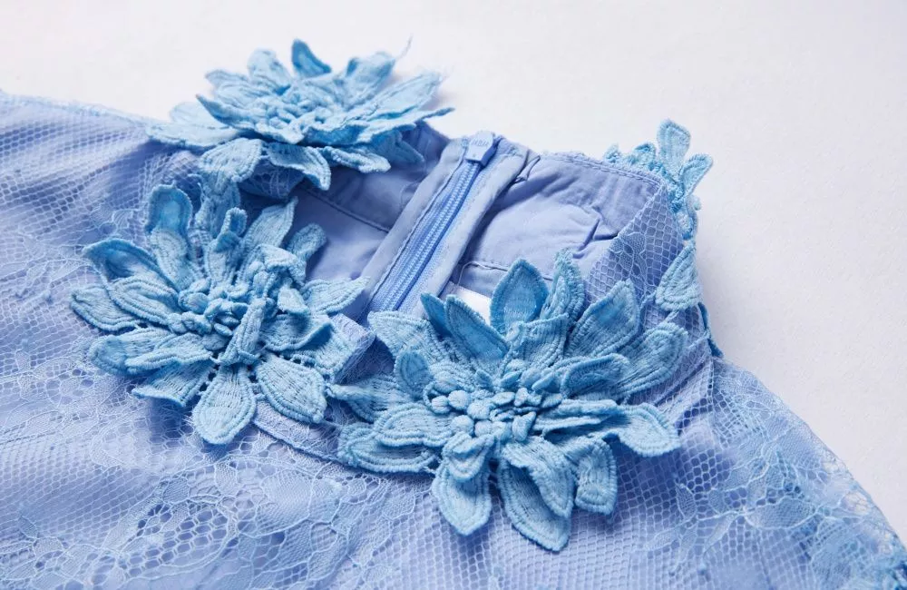 Il collo decorato con fiori ricamati crea un punto focale sofisticato, ideale per cerimonie, eventi eleganti o occasioni speciali. La gonna lunga con orlo rifinito in pizzo mantiene movimento e armonia, valorizzando la silhouette senza risultare rigida.