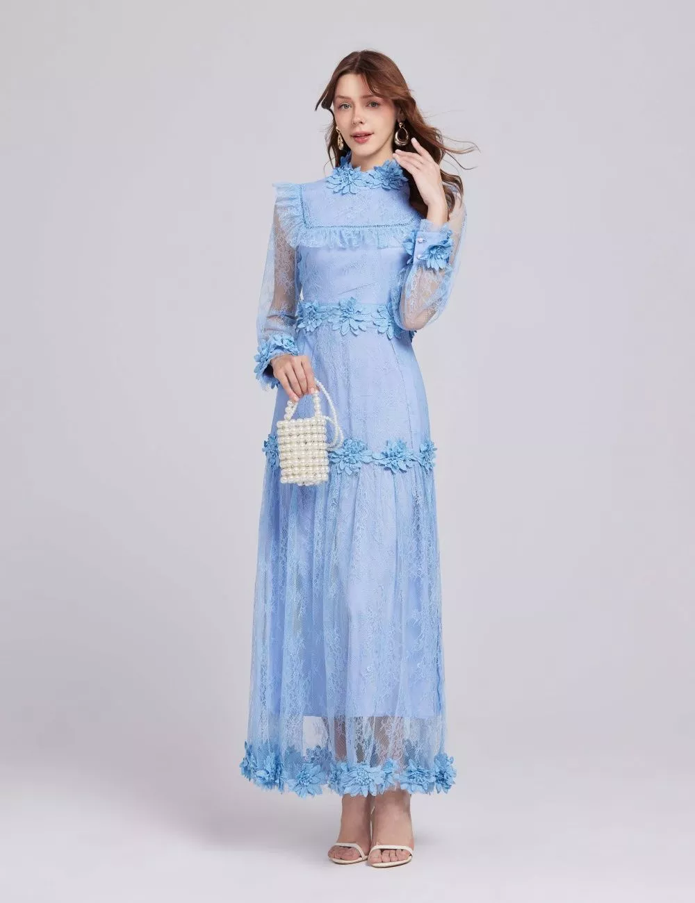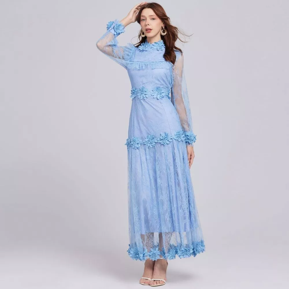 Abito Lungo Donna Azzurro In Pizzo Con Ricami Floreali E Maniche Lunghe CF62025