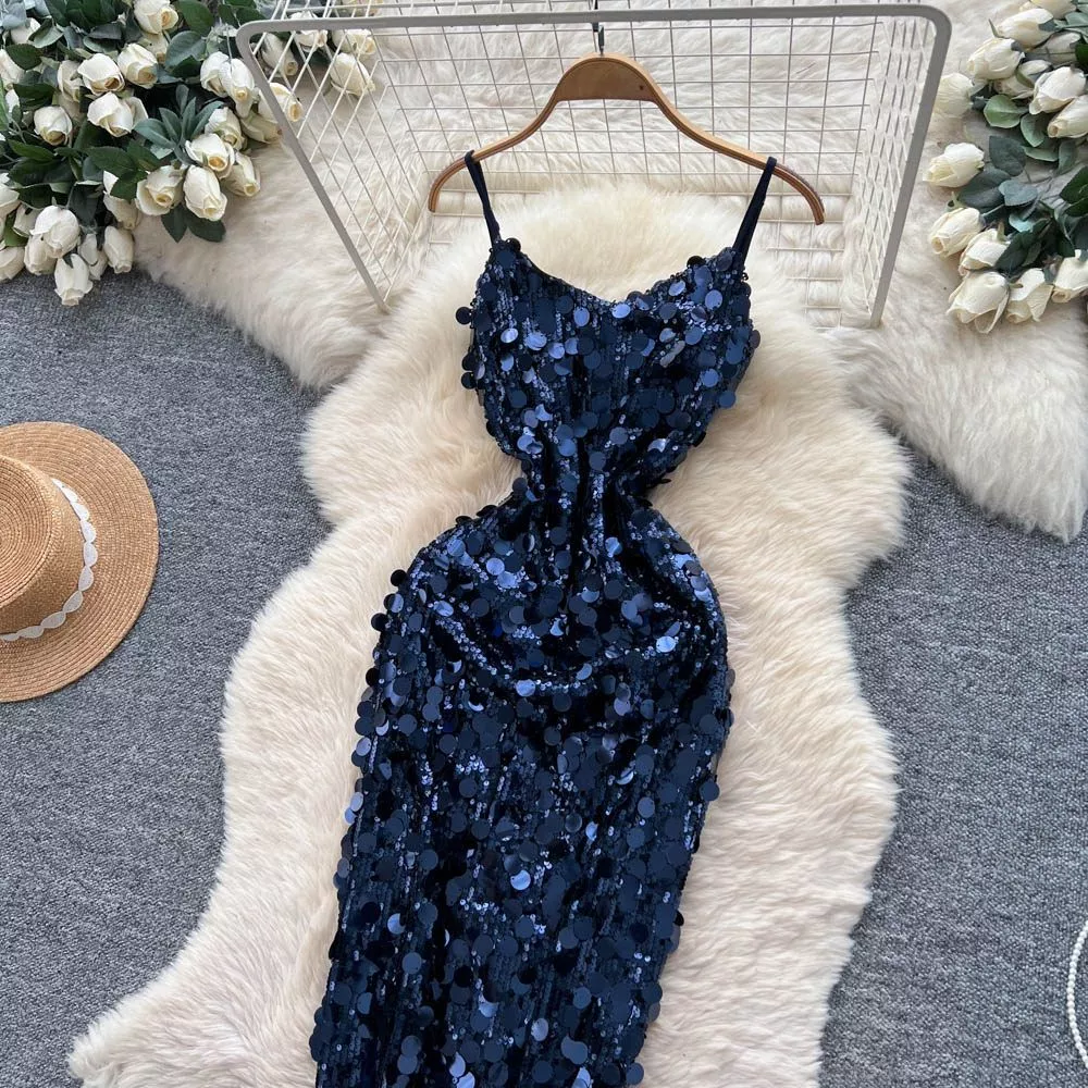 Abito Lungo Donna Blu Navy Con Spalline Paillettes E Spacco Cerimonia CF64158