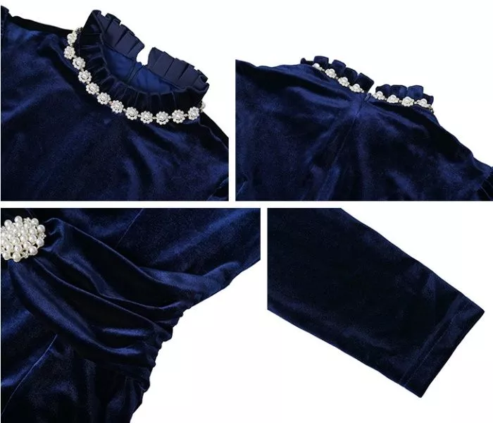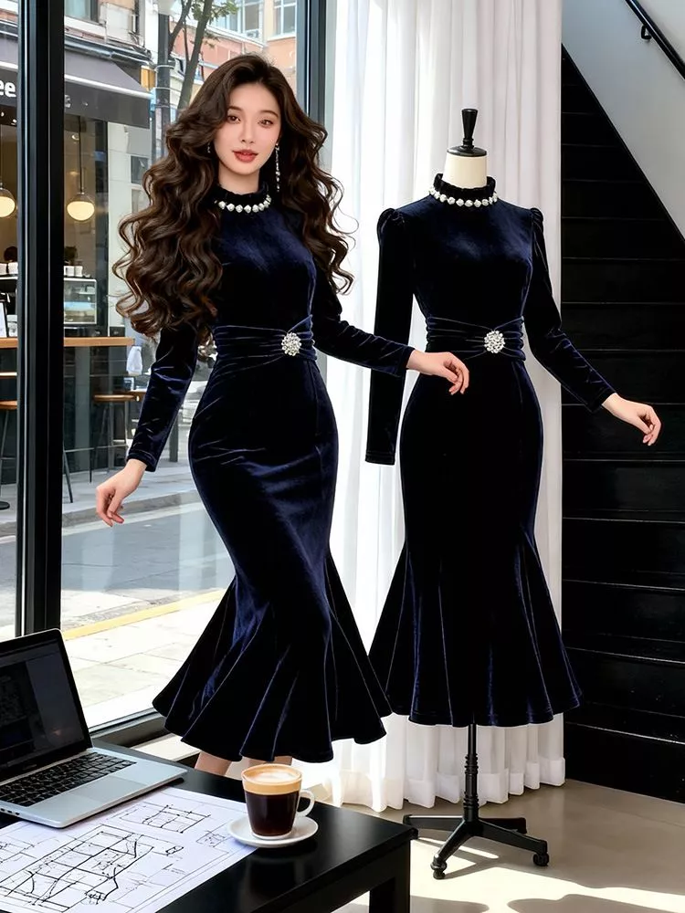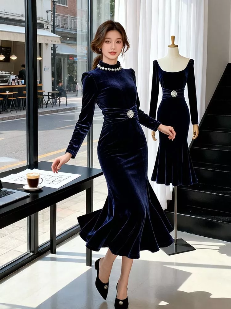 Abito lungo da donna in velluto dal fascino sofisticato, caratterizzato da una silhouette a sirena che accompagna le forme con eleganza. Il design presenta maniche lunghe, spalle leggermente strutturate e un raffinato dettaglio gioiello sia sul collo che in vita, che valorizza il punto vita creando un effetto slanciato. Il colore blu navy conferisce profondità e sobrietà, rendendo questo vestito ideale per eventi serali, cerimonie ed occasioni formali di alto livello.