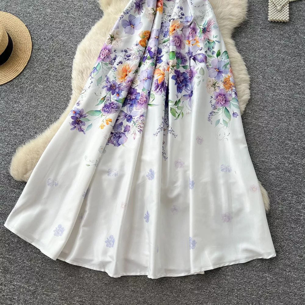 Vestito lungo donna dal design romantico e femminile, caratterizzato da una delicata stampa floreale su base chiara. La linea A valorizza il punto vita e scende morbida lungo la silhouette creando un effetto elegante e armonioso.